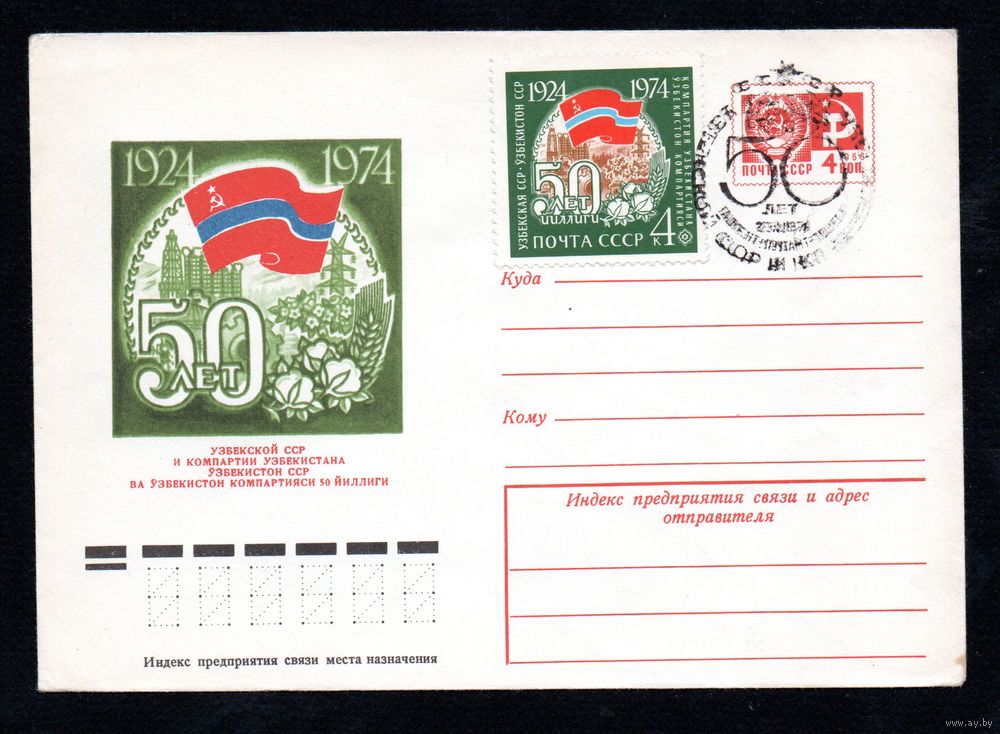 Художественный маркированный конверт СССР со спецгашением N 9519 (27.02.1974) 1924-1974 50 лет Узбекской ССР и Компартии Узбекистана