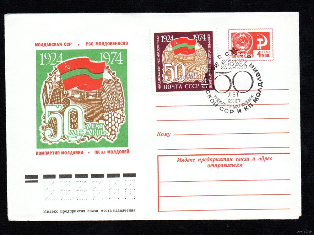Художественный маркированный конверт СССР со спецгашением N 9779 (11.06.1974) 1924-1974 50 лет Молдавская ССР Компартия Молдавии