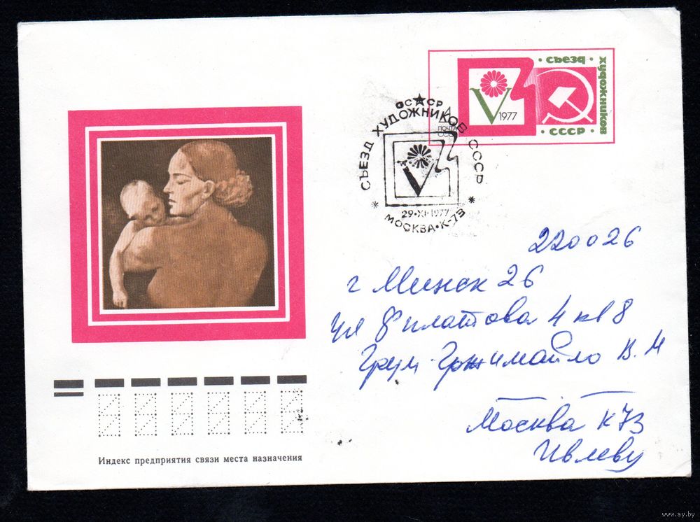 ![Художественный маркированный конверт СССР со спецгашением прошедший почту N 12126 (03.06.1977) [Иллюстрация по картине художника А.А. Дейнеки "Мать с ребенком на руках"] [V Съезд художников СССР]](https://s1-lot.aystatic.by/550x510/590/932/5039/5039932590_0.jpg)