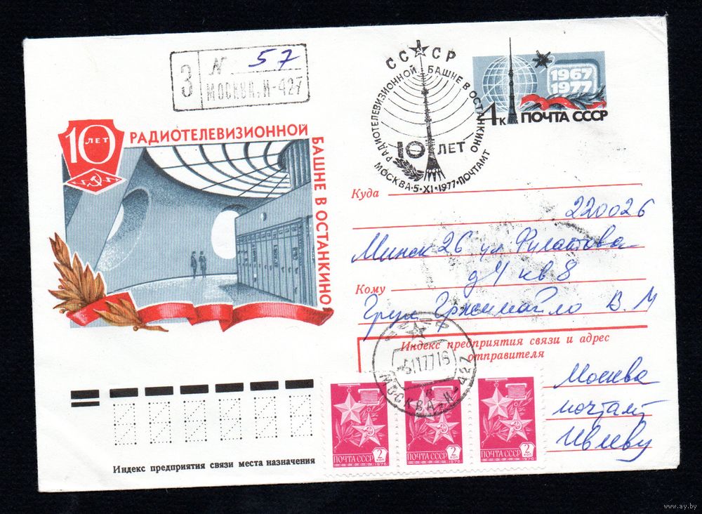 Художественный маркированный конверт СССР со спецгашением прошедший почту N 12370 (20.09.1977) 10 лет радиотелевизионной башне в Останкино