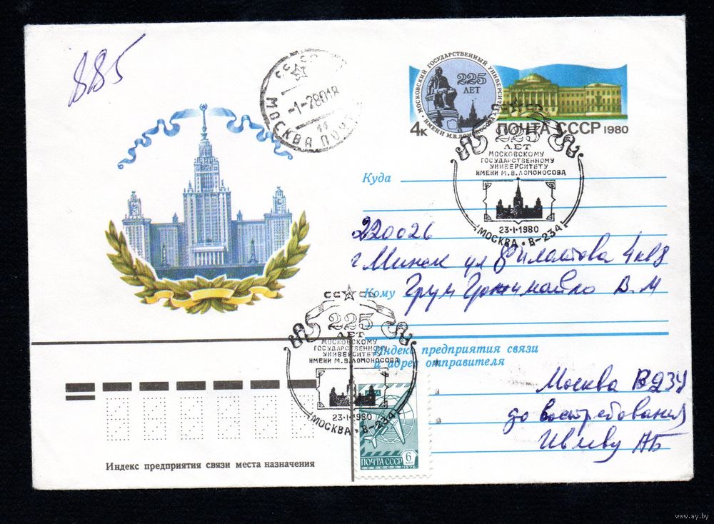 Художественный маркированный конверт СССР со спецгашением прошедший почту N 13922 (21.11.1979) 225 лет Московский государственный университет имени М.В. Ломоносова