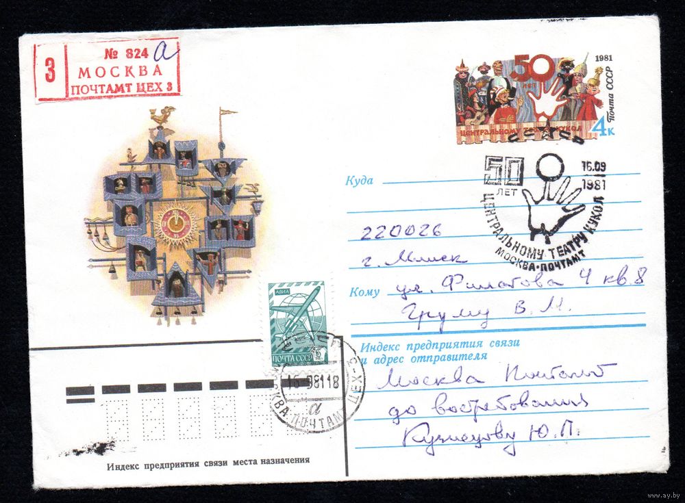 Художественный маркированный конверт СССР со спецгашением прошедший почту N 14950 (29.04.1981) 50 лет Центральному театру кукол
