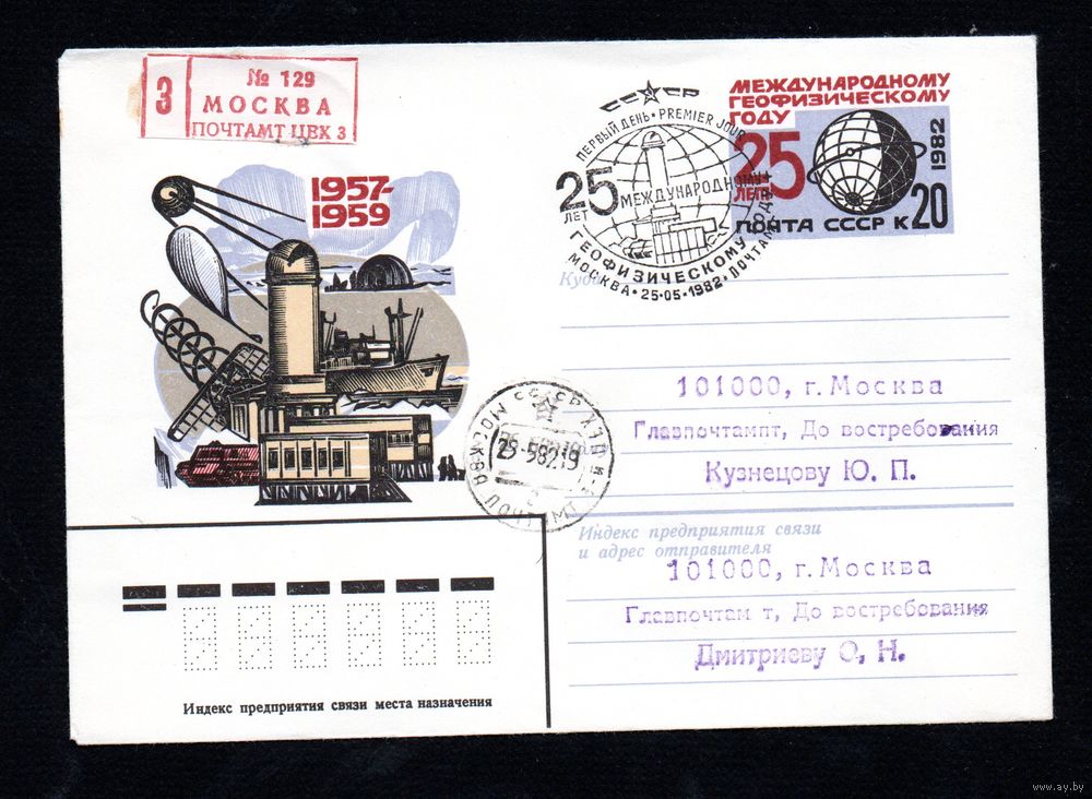 Художественный маркированный конверт СССР со спецгашением прошедший почту N 15460 (03.02.1982) 1957-1959 Международному геофизическому году - 25 лет