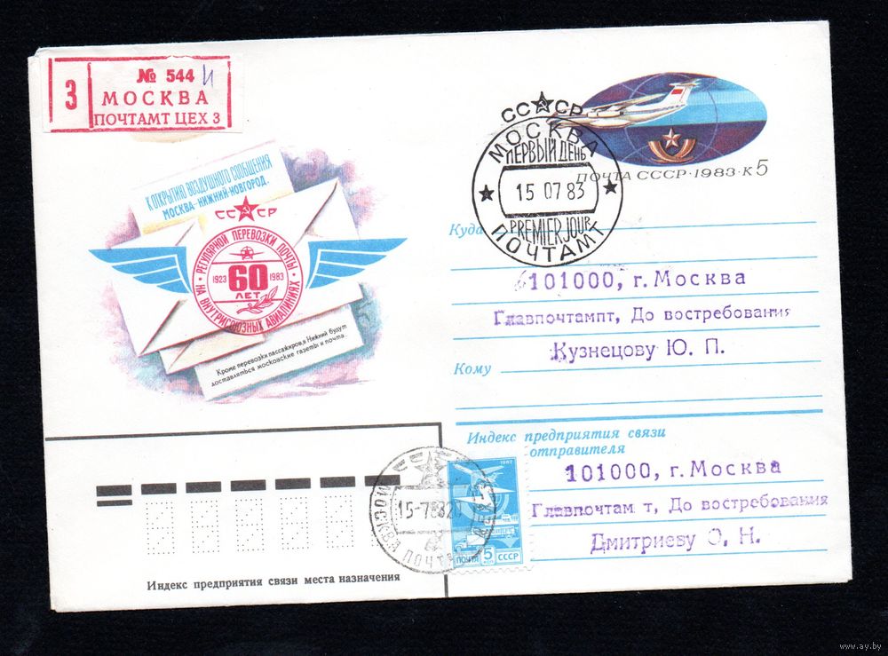 Художественный маркированный конверт СССР со спецгашением прошедший почту N 15464 (14.02.1982) 1923-1983 60 лет регулярной перевозке почты на внутрисоюзных авиалиниях