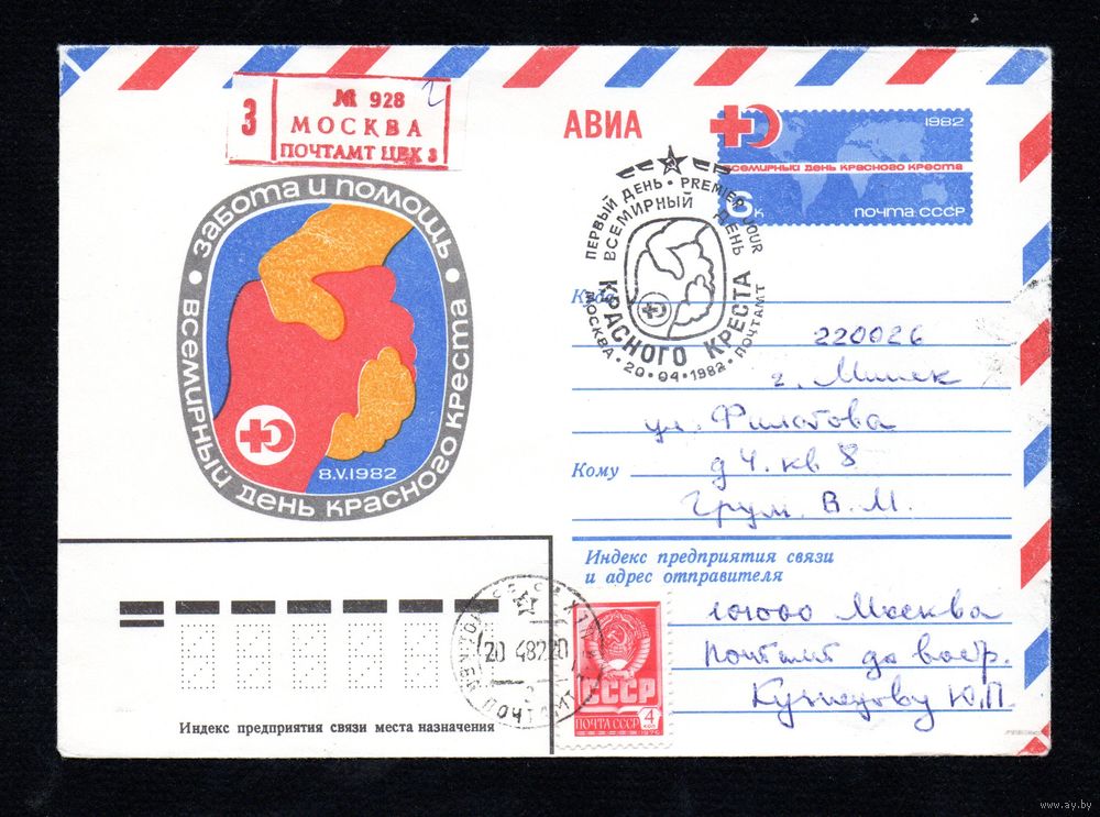 Художественный маркированный конверт СССР со спецгашением прошедший почту N 15479 (03.03.1982) АВИА Всемирный день Красного Креста Забота и помощь