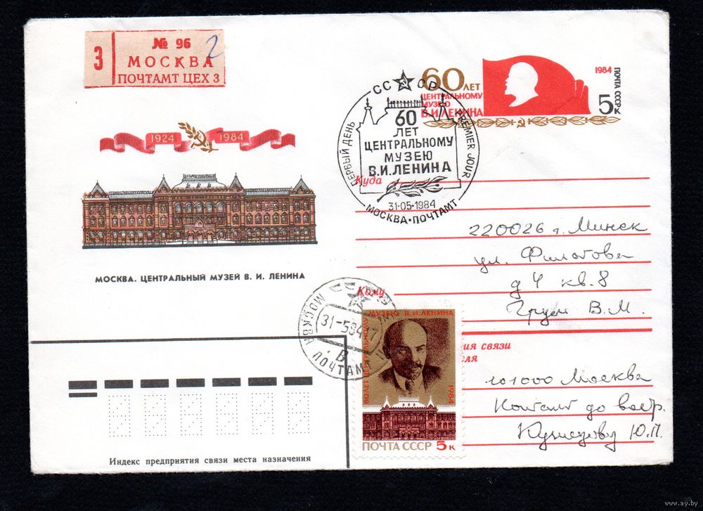 Художественный маркированный конверт СССР со спецгашением прошедший почту N 84-159 (16.04.1984) Москва. Центральный музей В.И. Ленина