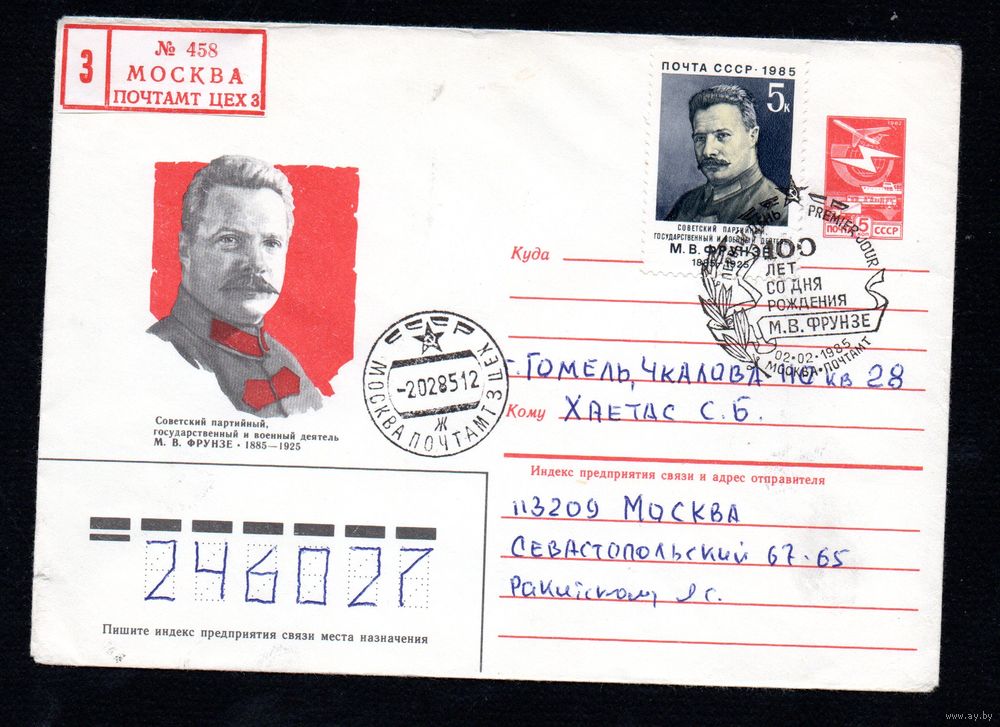 Художественный маркированный конверт СССР со спецгашением прошедший почту N 84-450 (15.10.1984) Советский партийный, государственный и военный деятель М.Ф. Фрунзе 1885-1925