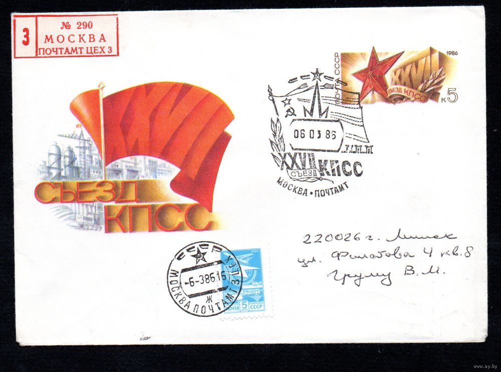 Художественный маркированный конверт СССР со спецгашением прошедший почту N 85-539 (20.11.1985) XXVII Съезд КПСС
