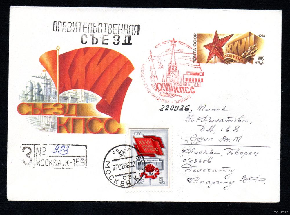 Художественный маркированный конверт СССР со спецгашением прошедший почту N 85-539 (20.11.1985) XXVII Съезд КПСС