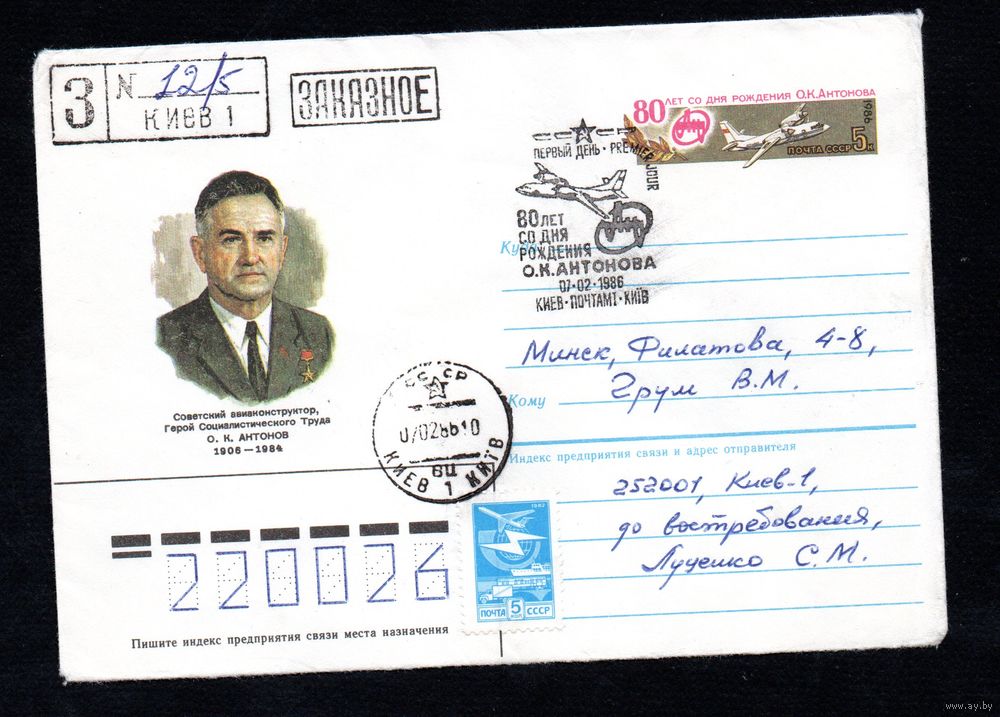 Художественный маркированный конверт СССР со спецгашением прошедший почту N 85-635 (27.12.1985) Советский авиаконструктор, Герой Социалистического Труда О. К. Антонов