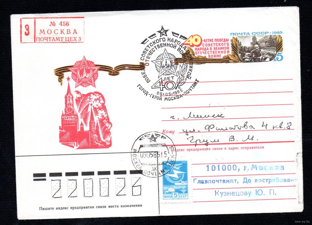 Художественный маркированный конверт СССР со спецгашением прошедший почту N 85-74 (08.02.1985) 40-летие Победы советского народа в Великой Отечественной войне