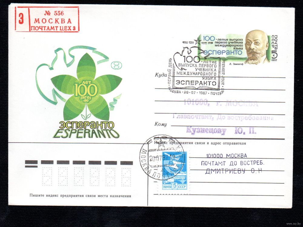 Художественный маркированный конверт СССР со спецгашением прошедший почту N 87-38 (27.01.1987) 100 лет эсперанто