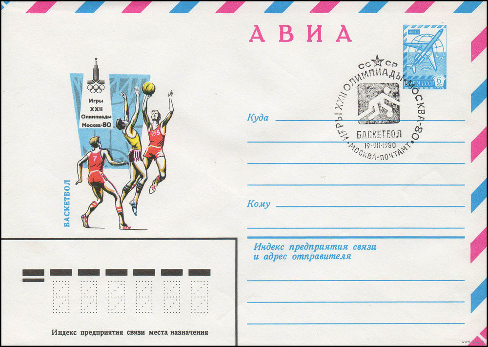 Художественный маркированный конверт СССР со спецгашениемN 13936 (28.11.1979) АВИА Игры XXII Олимпиады Москва-80 Баскетбол