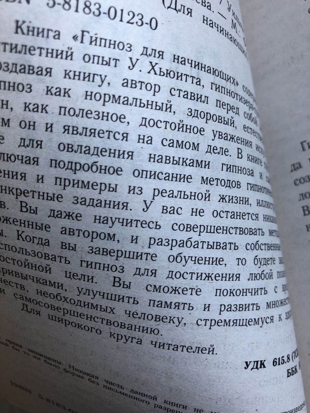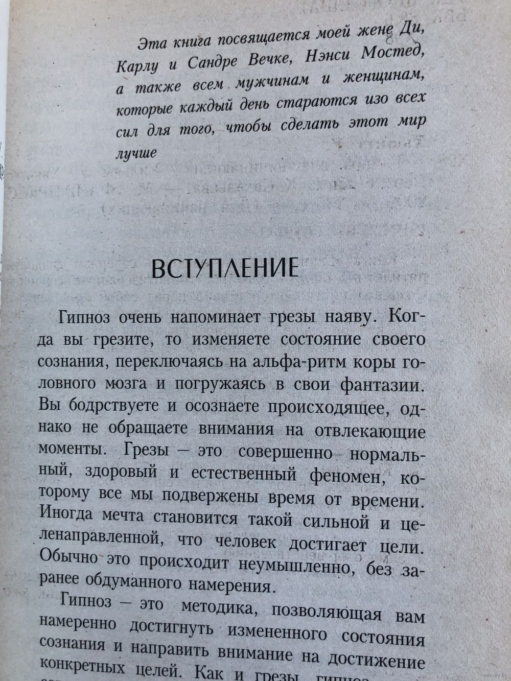 Книга «Гипноз для начинающих» содержит двадцатипятилетний опыт У. Хьюитта, гипнотизера-профессионала. Создавая книгу, автор ставил перед собой цель описать гипноз как нормальный, здоровый, естественный феномен, как полезное, достойное уважения искусство, каковым он и является на самом деле. В книге представлено все для овладения навыками гипноза и самогипноза, включая подробное описание методов гипнотического внушения и примеры из реальной жизни, иллюстрирующие конкретные задания. У вас не останется никаких вопросов. Вы даже научитесь совершенствовать методы, предложенные автором, и разрабатывать собственные подходы. Когда вы завершите обучение, то будете знать, как использовать гипноз для достижения любой полезной и достойной цели. Вы сможете покончить с вредными привычками, улучшить память и развить множество качеств, необходимых человеку, стремящемуся к здоровью и самосовершенствованию.