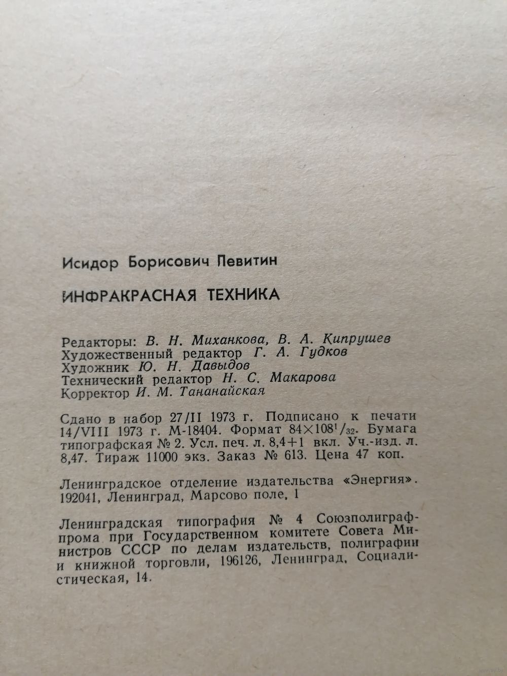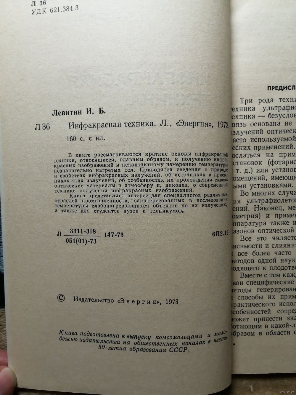 В книге рассматриваются краткие основы инфракрасной техники, относящиеся, главным образом, к получению инфракрасных изображений и неконтактному измерению температуры незначительно нагретых тел. Приводятся сведения о природе и свойствах инфракрасных излучений, об источниках и приемниках этих излучений, об особенностях их прохождения сквозь оптические материалы и атмосферу и, наконец, о современной технике получения инфракрасных изображений. Книга представляет интерес для специалистов различных отраслей промышленности, заинтересованных в исследовании температуры слабонагревающихся объектов по их излучению, а также для студентов вузов и техникумов.