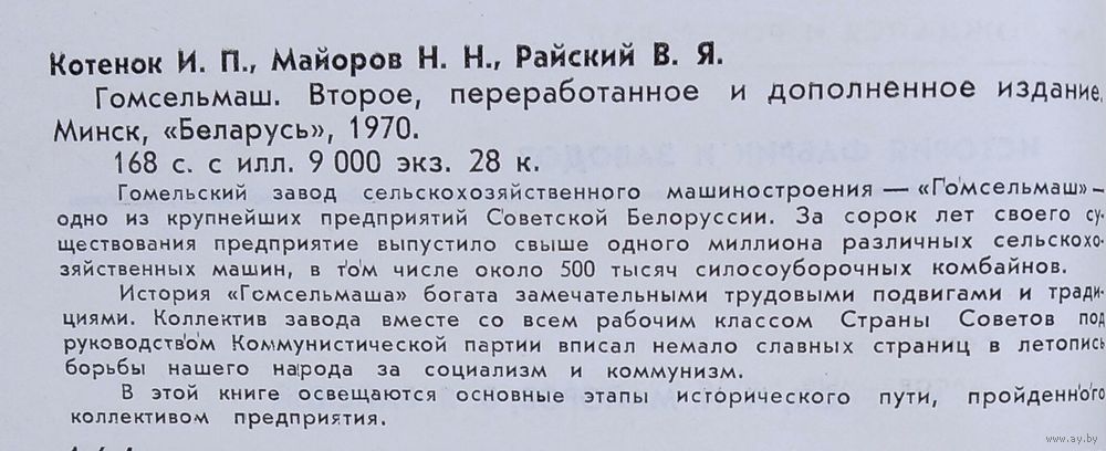 И. П. Котенок, Н. Н. Майоров, В. Я. Райский. Гомсельмаш. Серия: История фабрик и заводов. 2-е, переработанное и дополненное издание. - Минск : Беларусь, 1970 г. 166 с. Мягкая обложка. Уменш. формат.