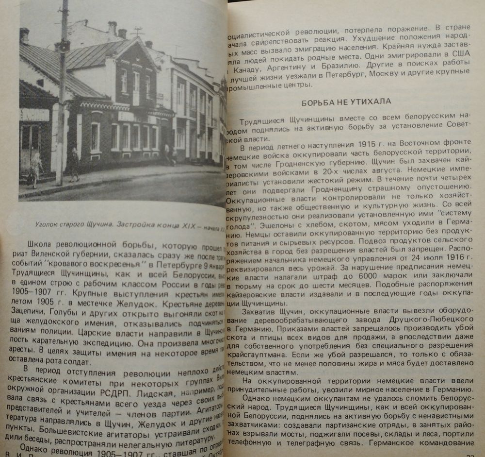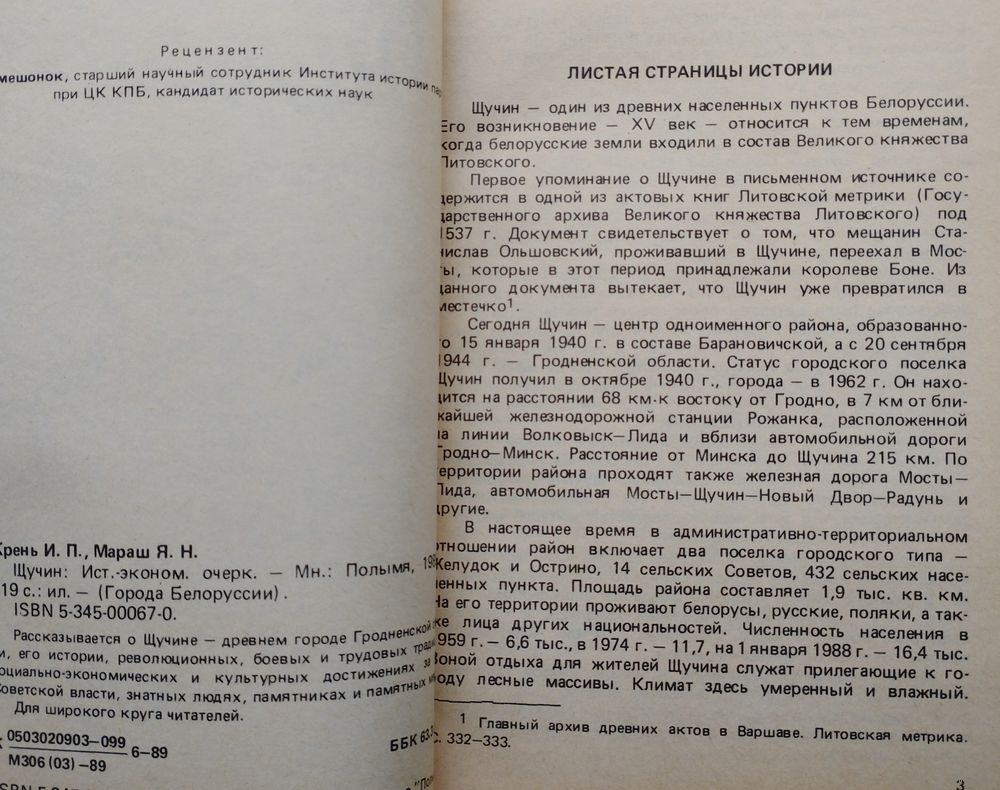 В советское время вопросам издания книг по истории развития малых городов уделялось мало внимания. Достаточно сказать, что только в 1980-х годах начала активно издаваться серия книг «Города Белоруссии», в рамках которой в 1989 году в издательстве «Полымя» вышло первое научно-популярное издание тиражом 10000 экземпляров, посвящённое Щучину. Авторы Я.Н. Мараш и И.П. Крень в монографии «Щучин» впервые рассказали об истории города, его боевых и трудовых традициях, социально-экономических и культурных достижениях за годы советской власти, известных людях, памятниках и памятных местах.