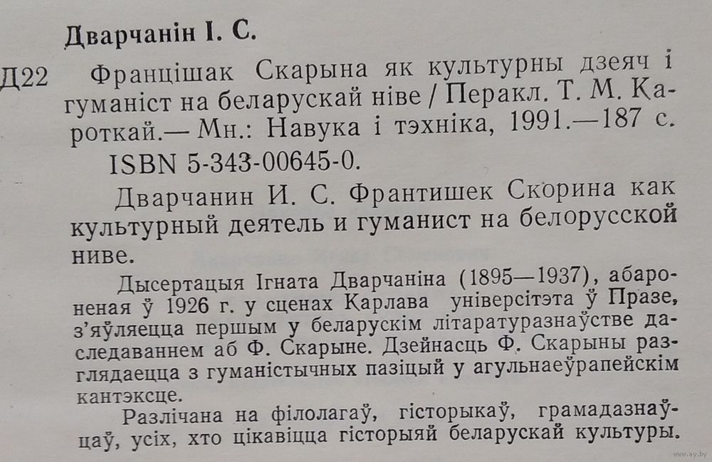 І. С. Дварчанін. Францішак Скарына як культурны дзеяч і гуманіст на беларускай ніве. Мінск. Навука і тэхніка, 1991 г. 185 с. Цверды пераплет.