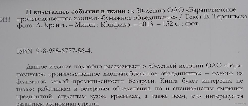 И вплетались события в ткани: к 50-летию ОАО "Барановичское производственное хлопчатобумажное объединение". Текст: Е. Терентьева. Минск : Конфидо, 2013 г 151 с. Твердый переплет. Энциклопедический формат.