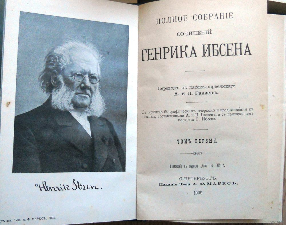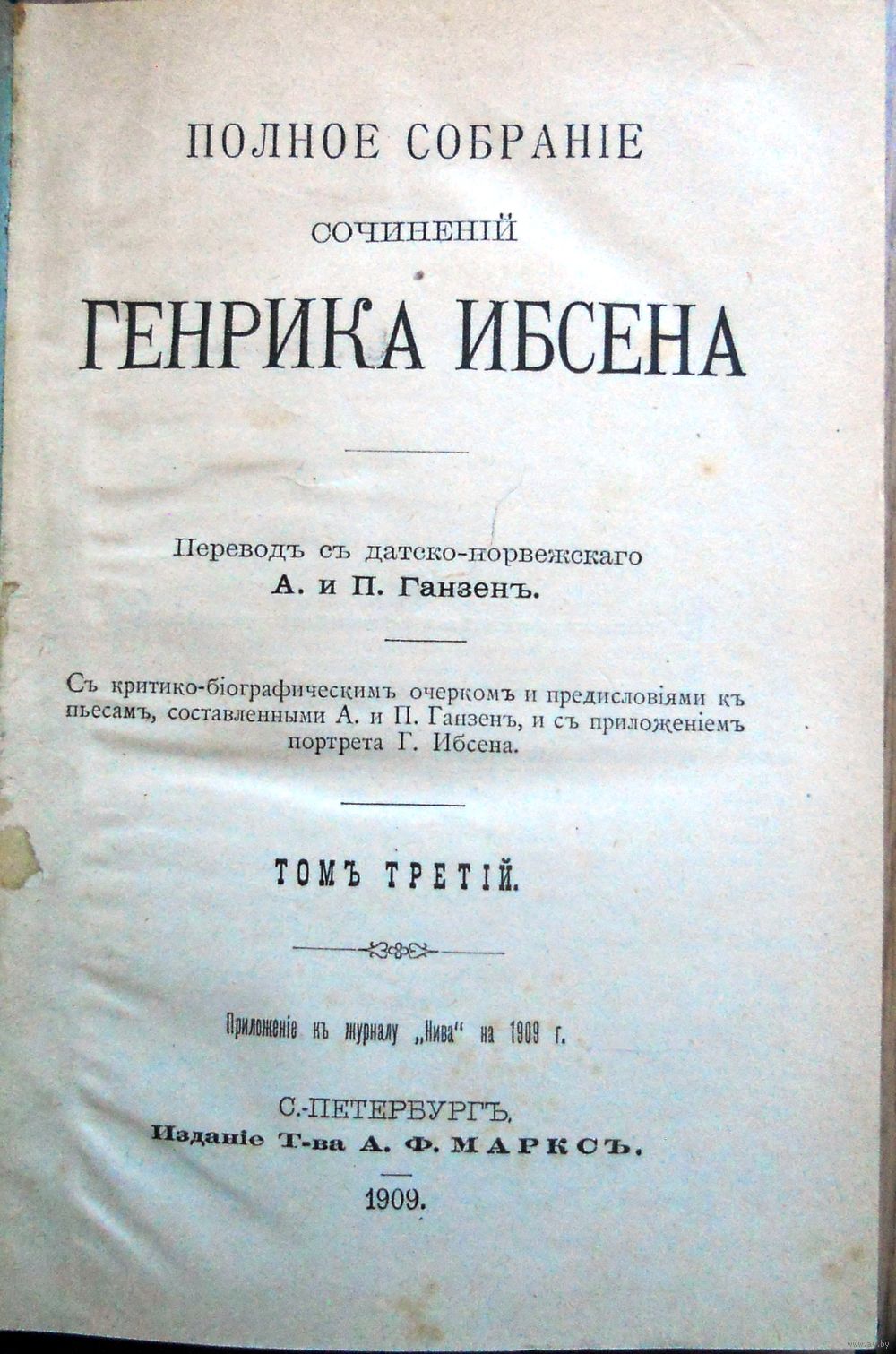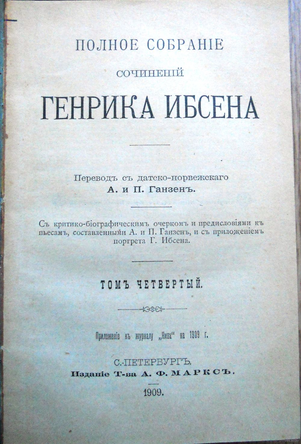 (Прил. к журн. "Нива" 1909 г.). Перевод с датско-норвежскаго А. и П. Ганзенъ. С критико-биографическими очерками и предисловиями к пьесам составленными А. и П. Ганзенъ и с приложениями портрета Г. Ибсена. Т. 1. Кн. 1-4. Комедия любви [и др.]. 632 с; фронт.