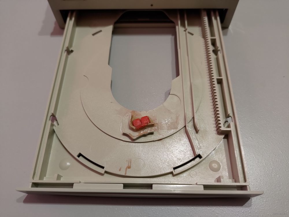 Есть отремонтированное повреждение направляющей на нижней части лотка - свидетельство того времени, когда подобное ремонтировали, а не выбрасывали привод, так как эти вещи ст0или немало, а люди зарабатывали очень не много.