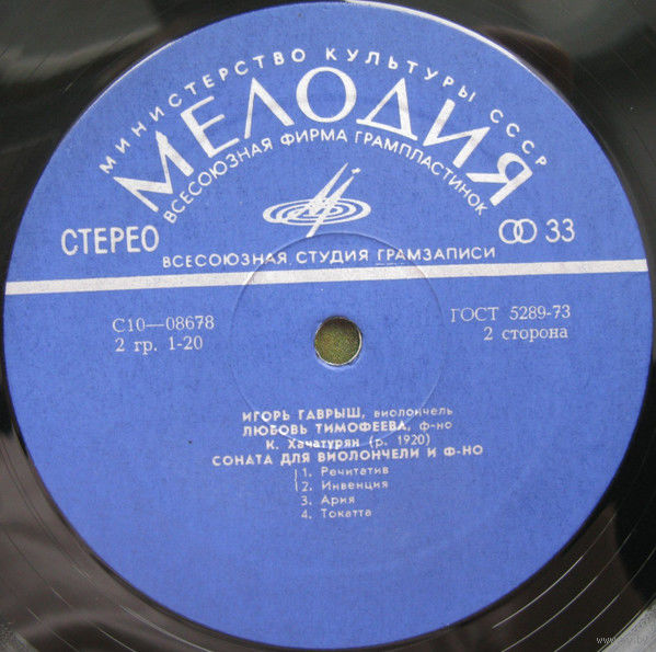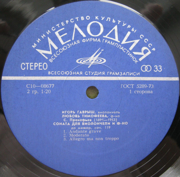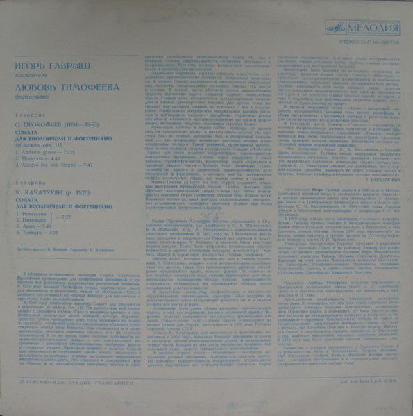 Игорь Гаврыш,Любовь Тимофеева - С. Прокофьев/К. Хачатурян - Соната Для Виолончели И Фортепиано - 1977,Vinyl,LP,made in USSR.