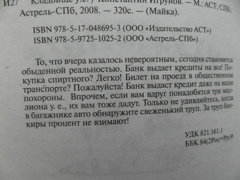 То, что вчера казалось невероятным, сегодня становится обыденной реальностью. Банк выдает кредиты на все! Покупка спиртного? Легко! Билет на проезд в общественном транспорте? Пожалуйста! Банк выдаст кредит даже на ваши похороны. Впрочем, если вам вдруг понадобятся три миллиона у. е., их вам тоже дадут. Только не удивляйтесь, когда в багажнике авто обнаружите свеженький труп. За труп банкиры процент не взимают!