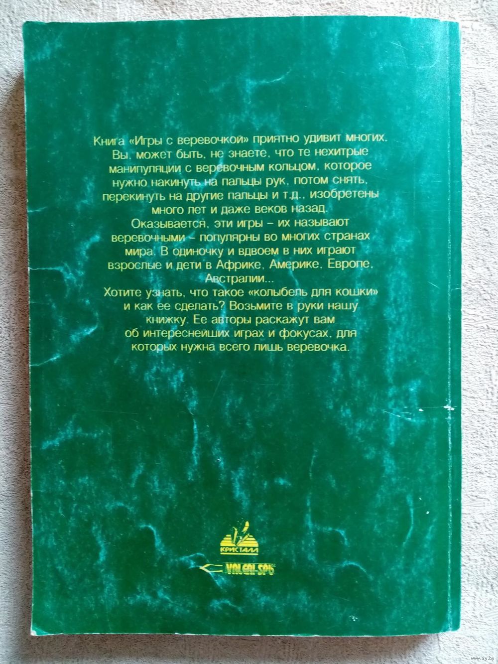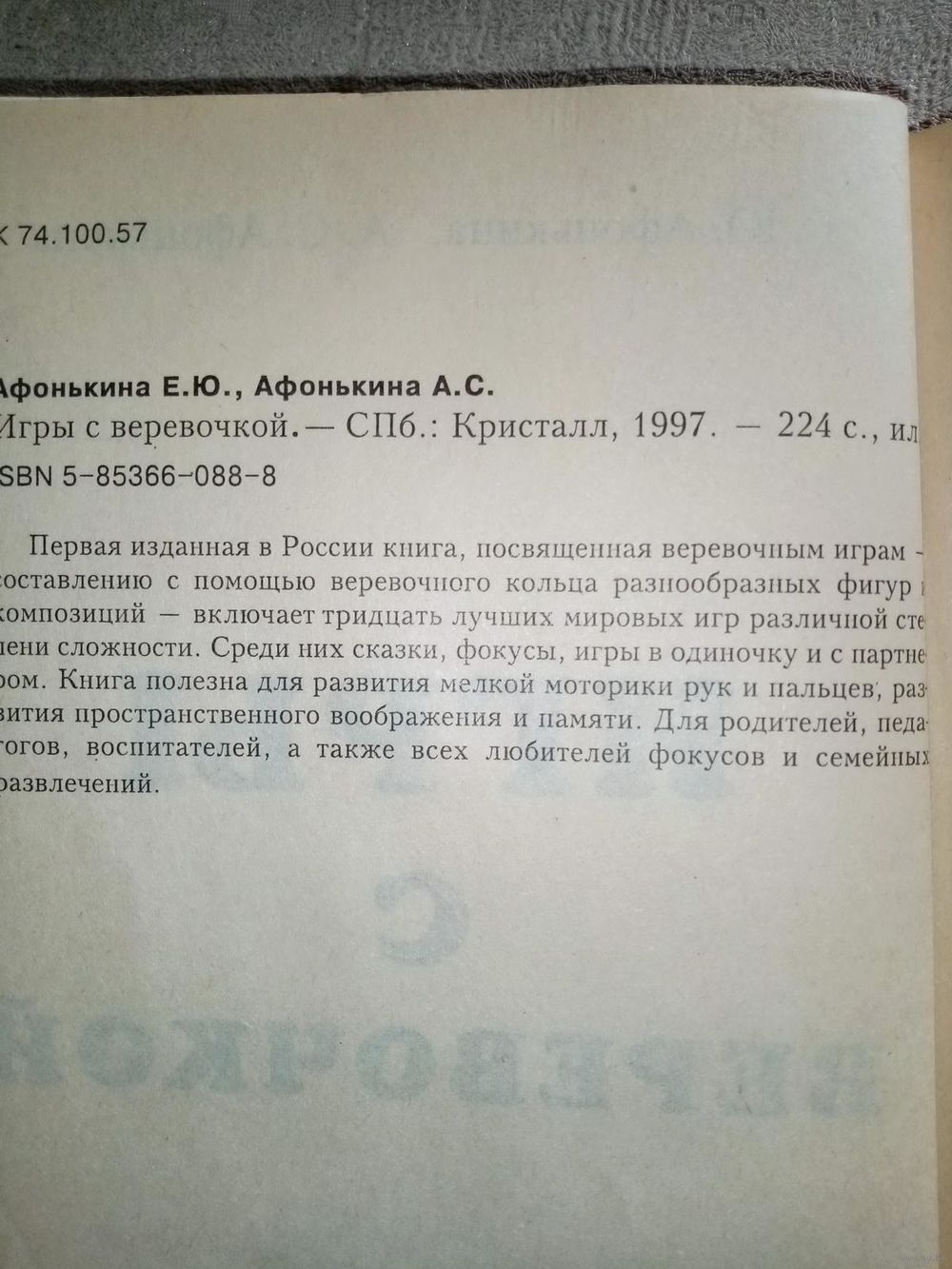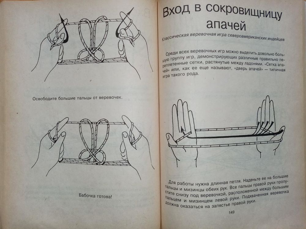 Первая изданная в России книга, посвящённая верёвочным играм – составлению с помощью верёвочного кольца разнообразных фигур и композиций – включает тридцать лучших мировых игр различной степени сложности. Среди них сказки, фокусы, игры в одиночку и с партнёром. Книга полезна для развития мелкой моторики рук и пальцев, развития пространственного воображения и памяти.