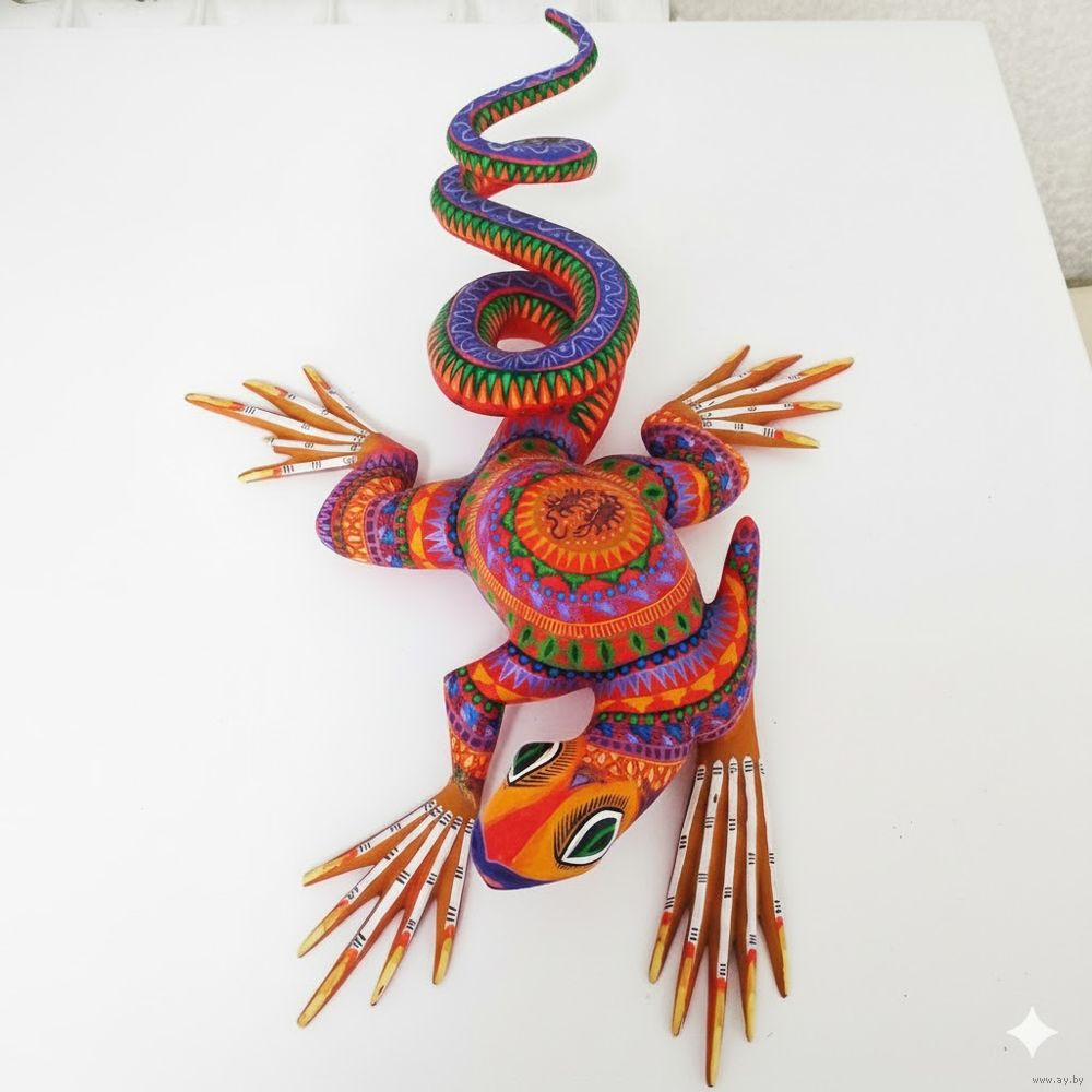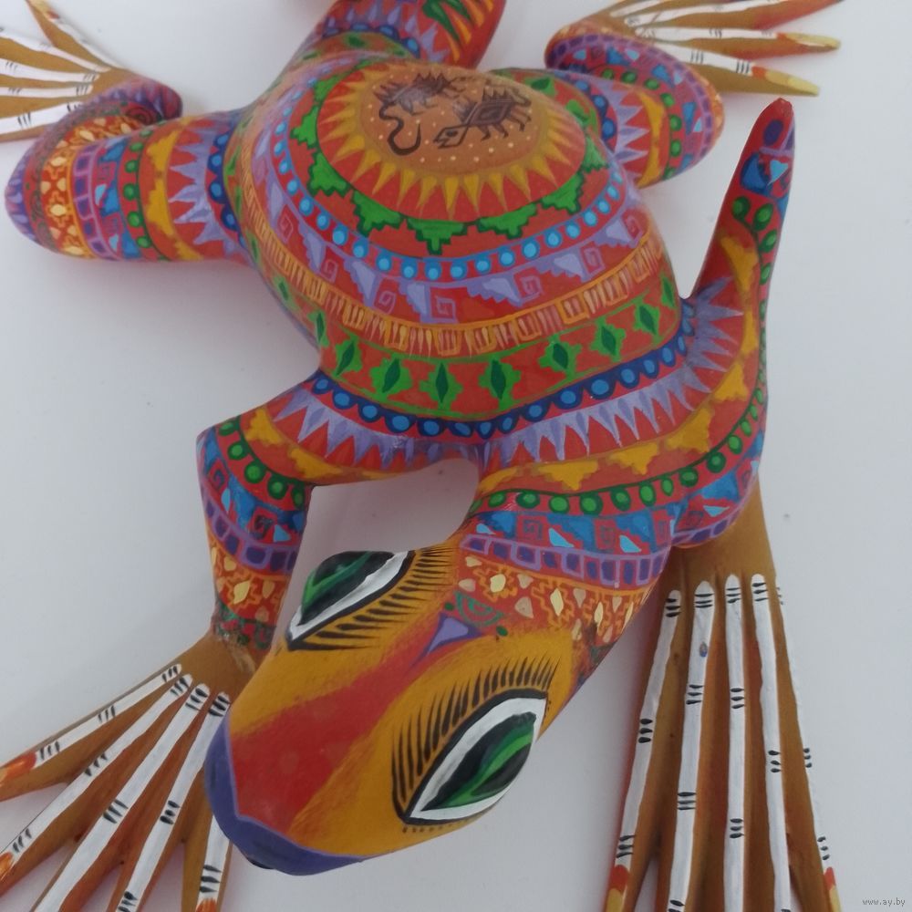 Ацтекская деревянная скульптура, известная как алебрихе. Она представляет собой игуану, вырезанную из дерева копал и расписанную вручную яркими цветами и замысловатыми узорами.