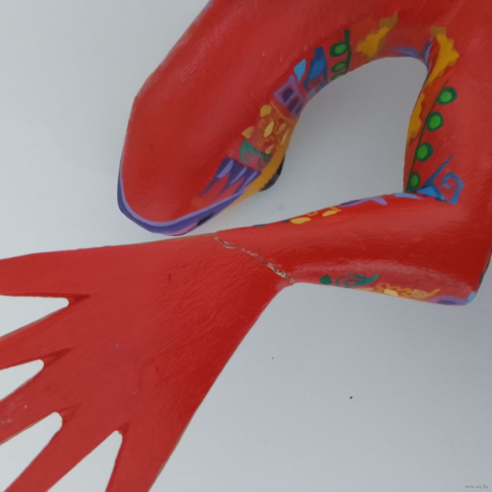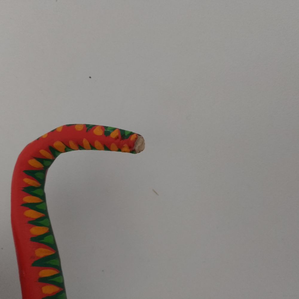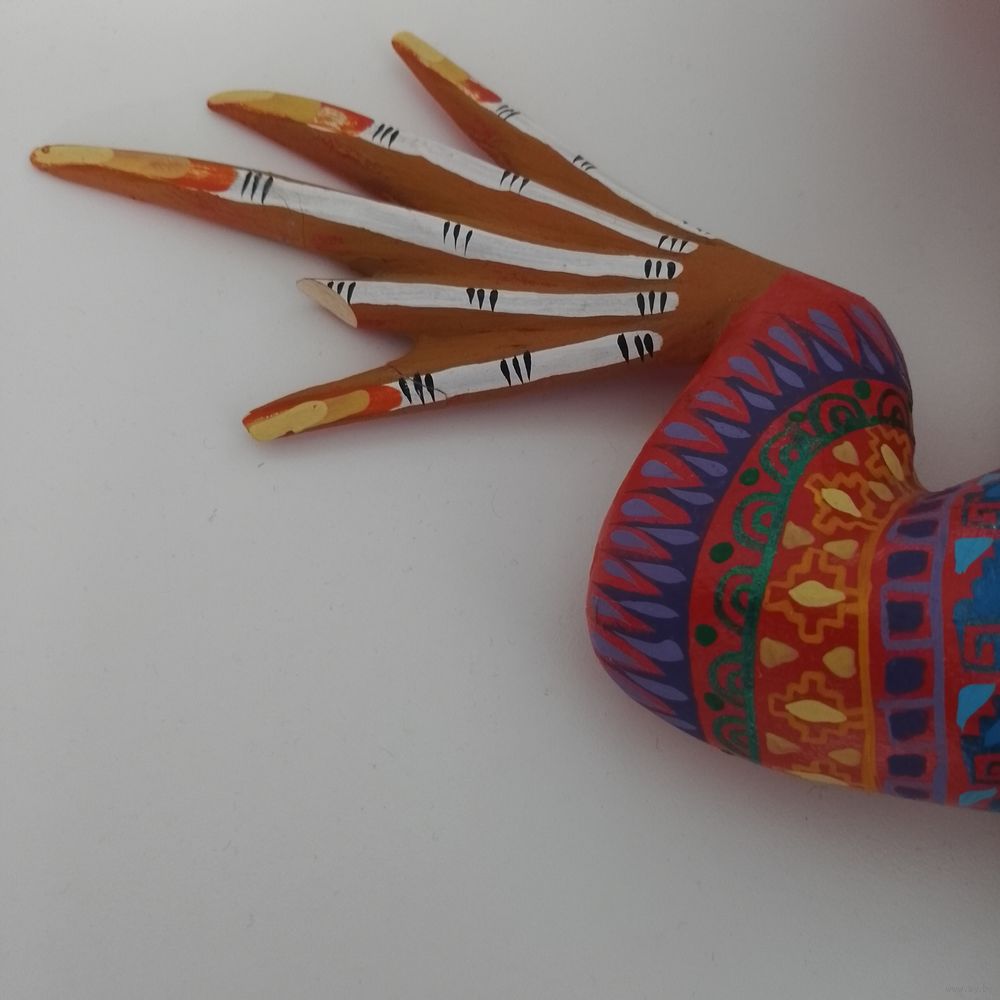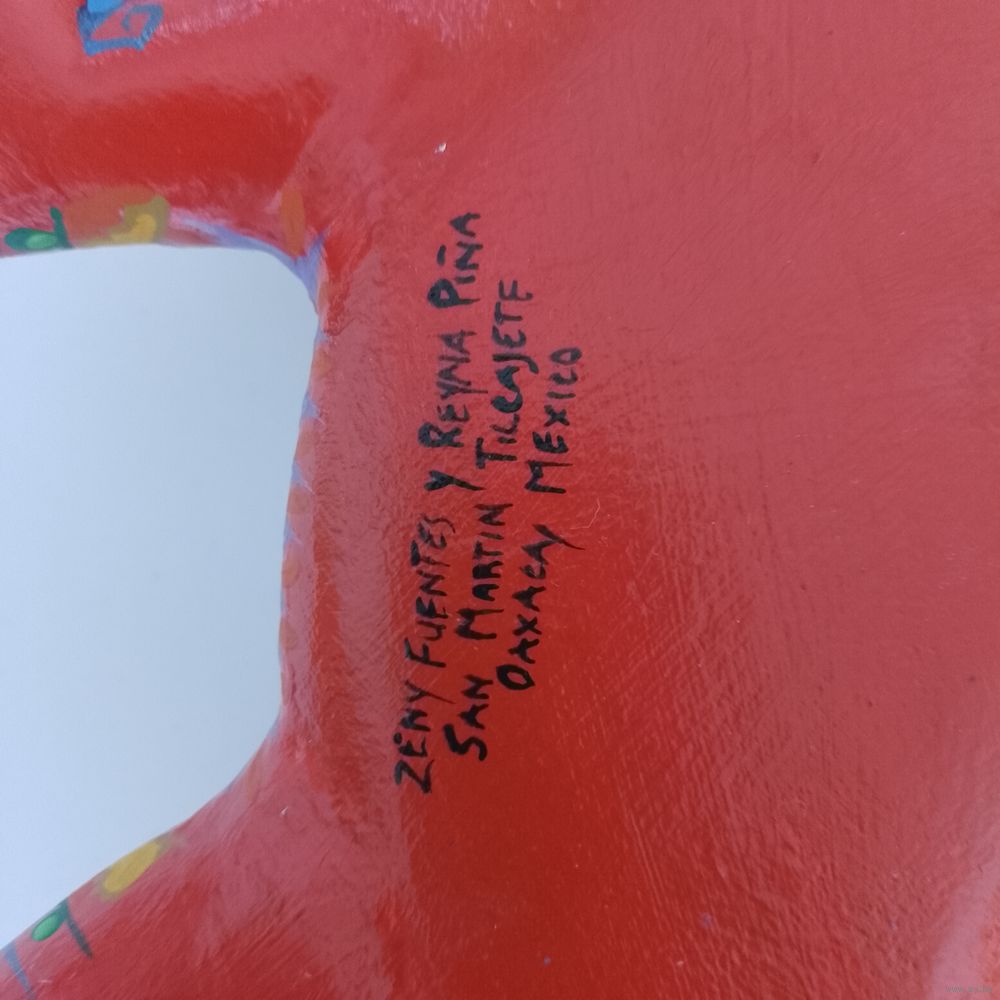 Надпись на изделии относится к мексиканским ремесленникам Зини Фуэнтесу (Zeny Fuentes) и Рейне Пинье (Reyna Piña), которые создают деревянные фигурки, известные как алебрихе.
