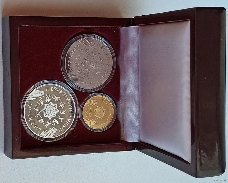 | II европейские игры Минск, 2019, набор, полный комплект 50 рублей золото, 20 рублей серебро, 1 рубль -медно-никель в шикарном деревянном футляре | |
