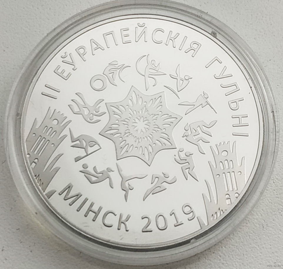 серебряная и медно-никелевая памятные монеты: в центре – стилизованное изображение солнца; вокруг – оригинальные пиктограммы спортивных соревнований; справа и слева – стилизованный образ архитектурного комплекса "Ворота Минска"; вверху надпись: II ЕЎРАПЕЙСКІЯ ГУЛЬНІ, внизу – МІНСК 2019.
