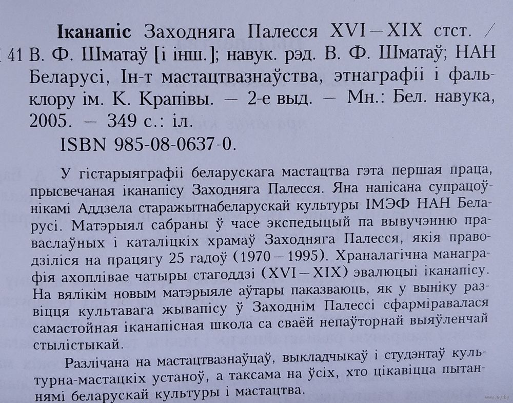 Iканапiс Заходняга Палесся XVI―XIX стст. Нацыянальная акадэмія навук Беларусі, Інстытут мастацтвазнаўства, этнаграфіі і фальклору імя К. Крапівы. - 2-е выд. - Мінск : Беларуская навука. 2005 г.348 с. Цверды пераплет. Паменш.фармат.