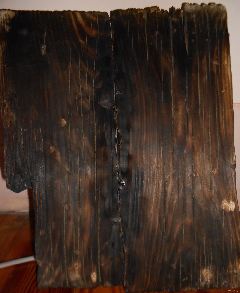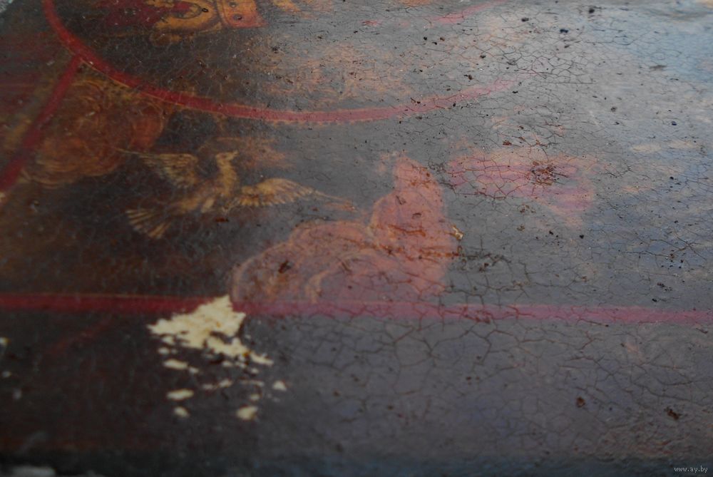 Икона на дереве, дерево покрыто мелом, по мелу сюжет, краска потрескалась от времени. Возраст не знаю , у меня лет 30. Размер там где целая 30,5 см на 25,5 см, толщина 2 см