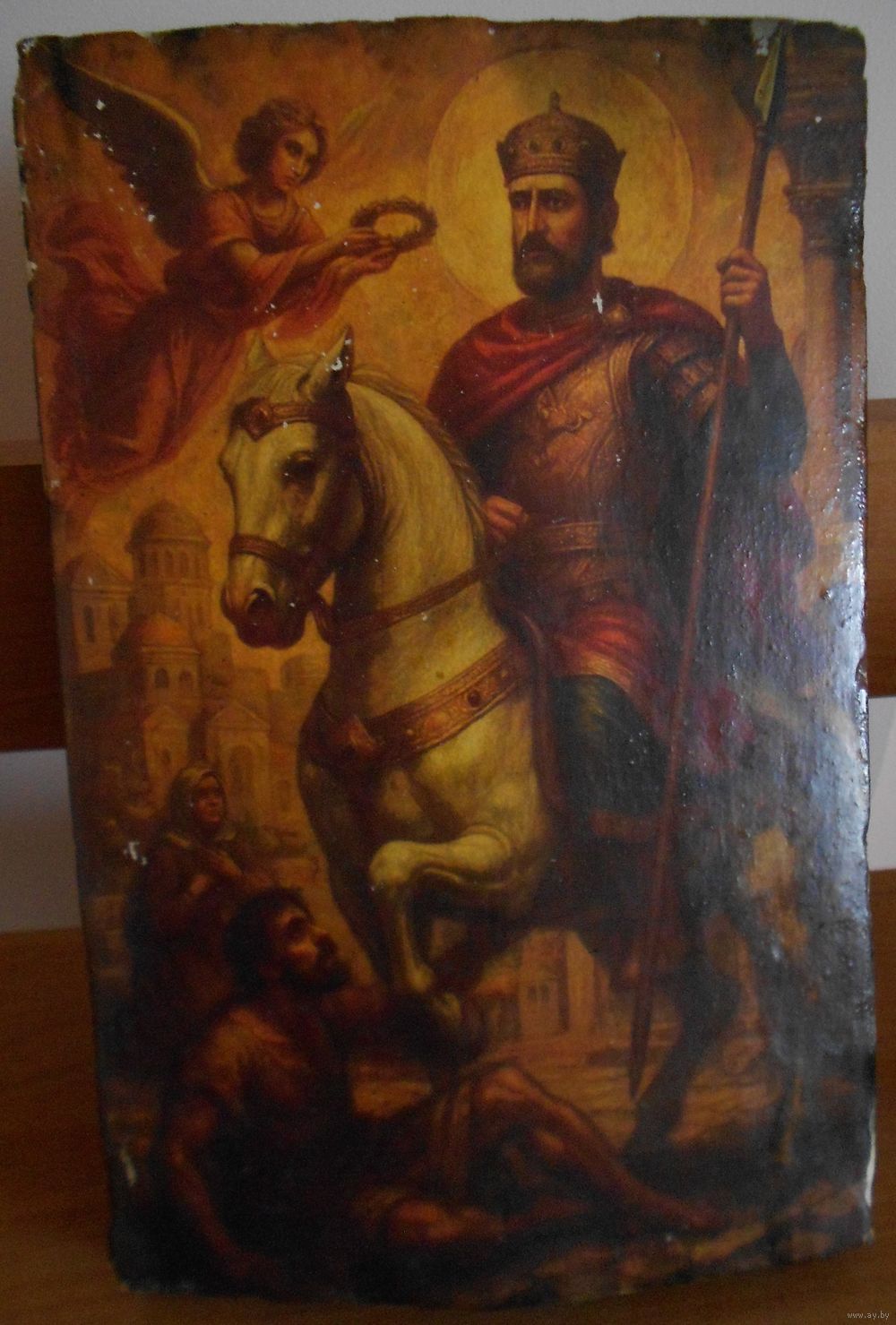 икона на дереве покрытом мелом , по мелу сюжет краска ,обработана от жуков , размер 30 см на 20 см толщина 2,5 см возраст мне неизвестен