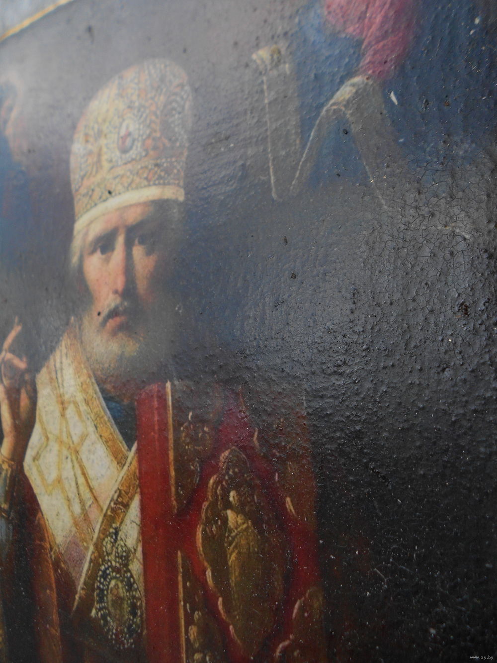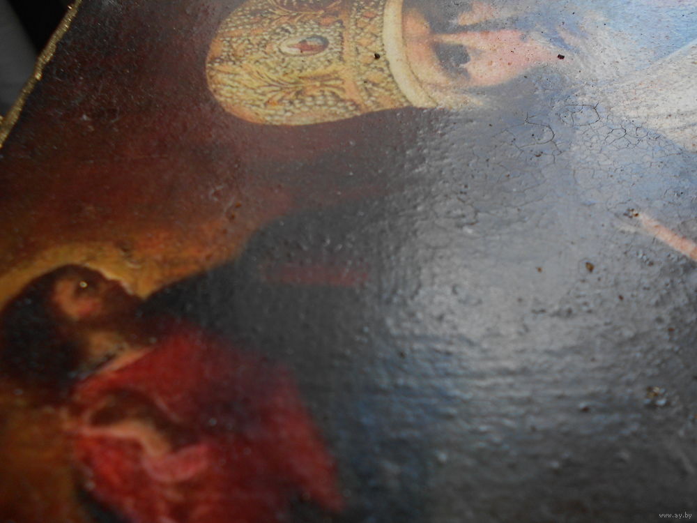 икона на дереве 20 век , дерево покрыто материалом , по материалу мел , по мелу икона , местами краска потрескалась , размер 22 см на 18 см , толщина около 1,5 см