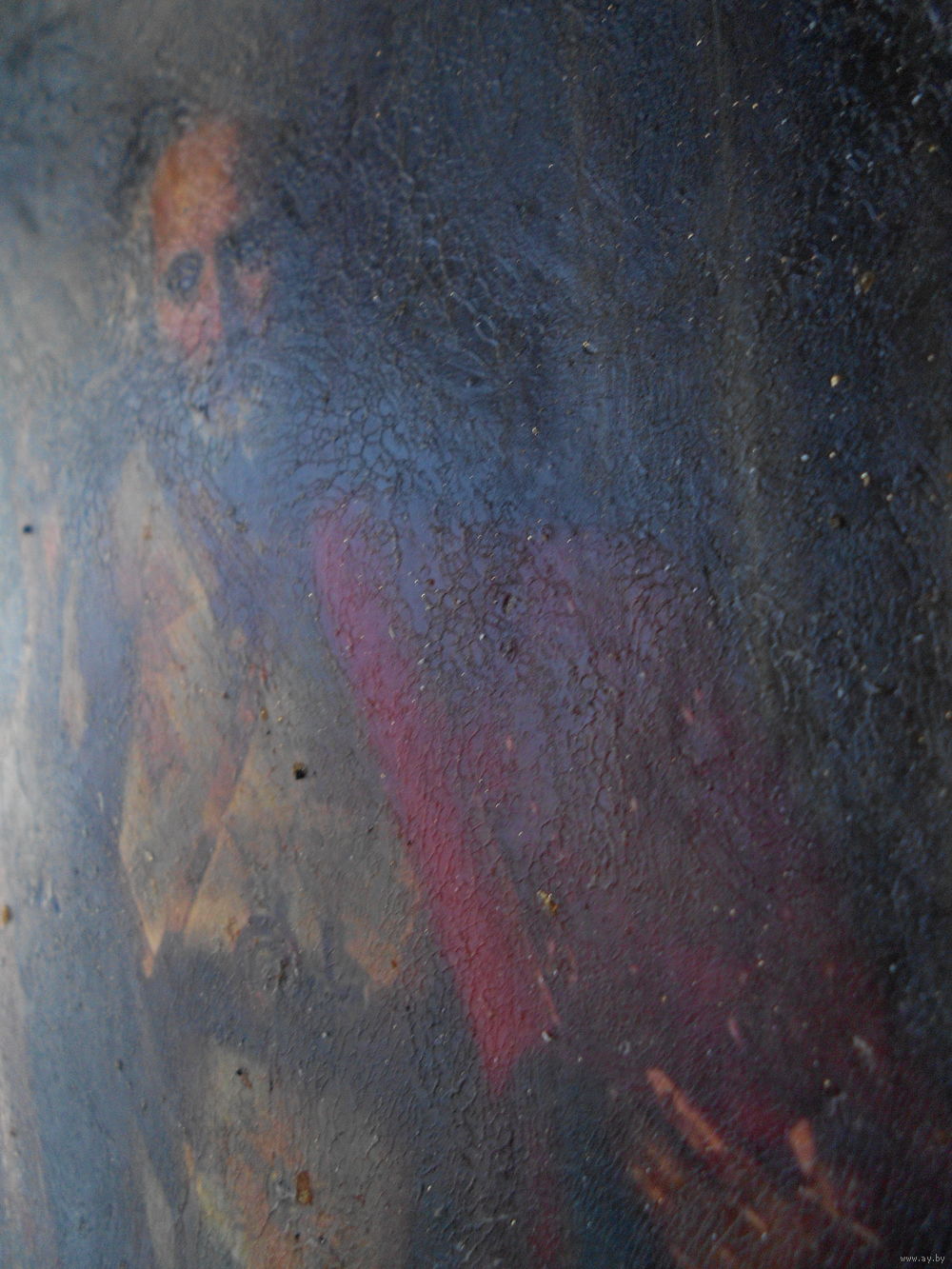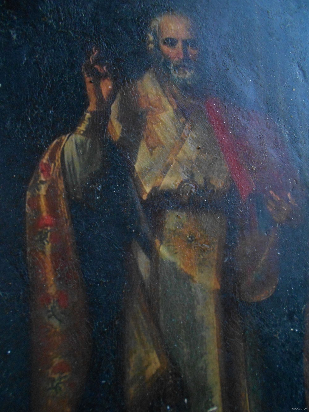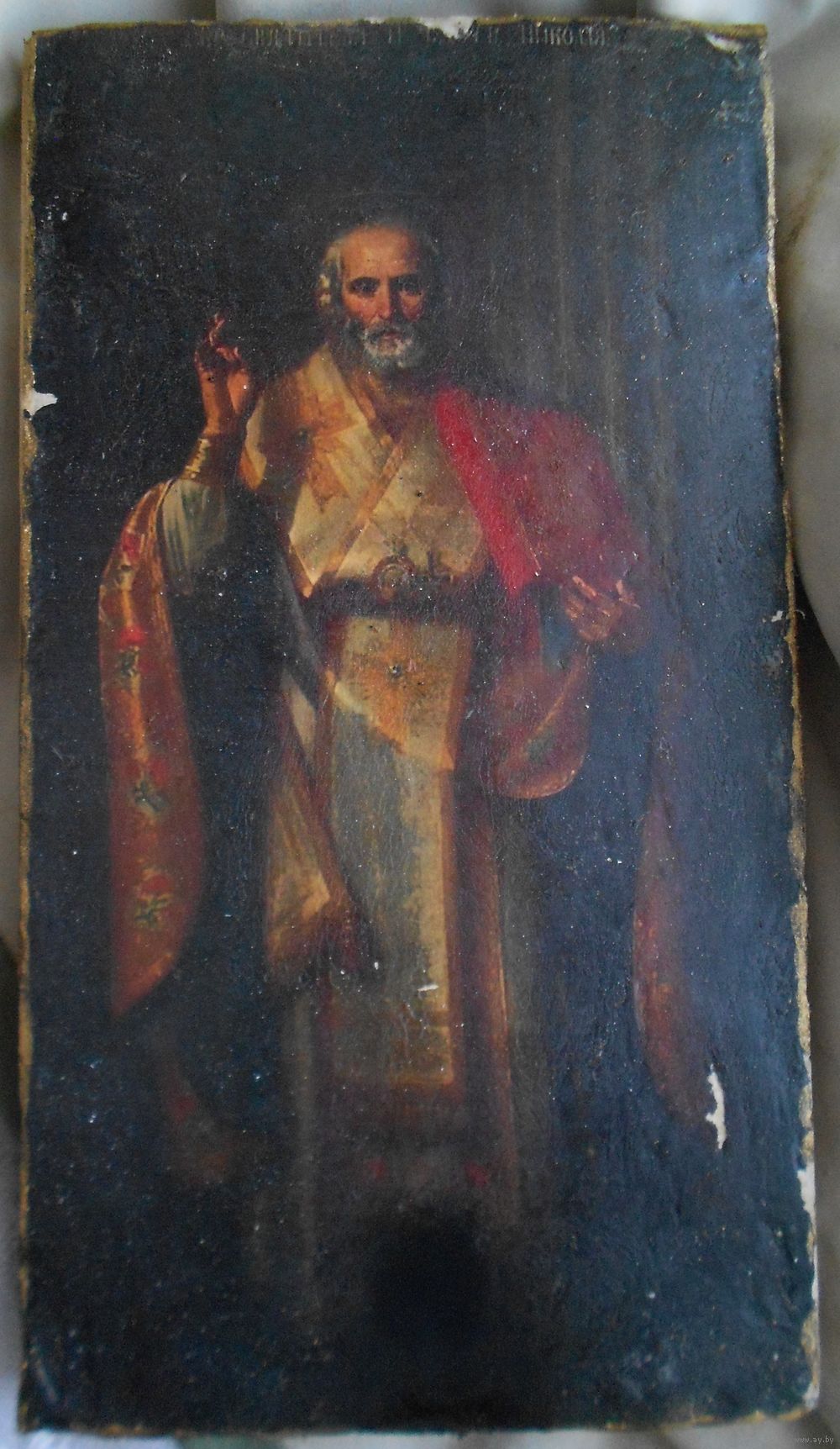 Икона на дереве, дерево покрыто материей, по материи мел, по мелу икона, краска потрескалась, возраст точный не знаю, размер 29,5 см на 16 см толщина 2,5 см.