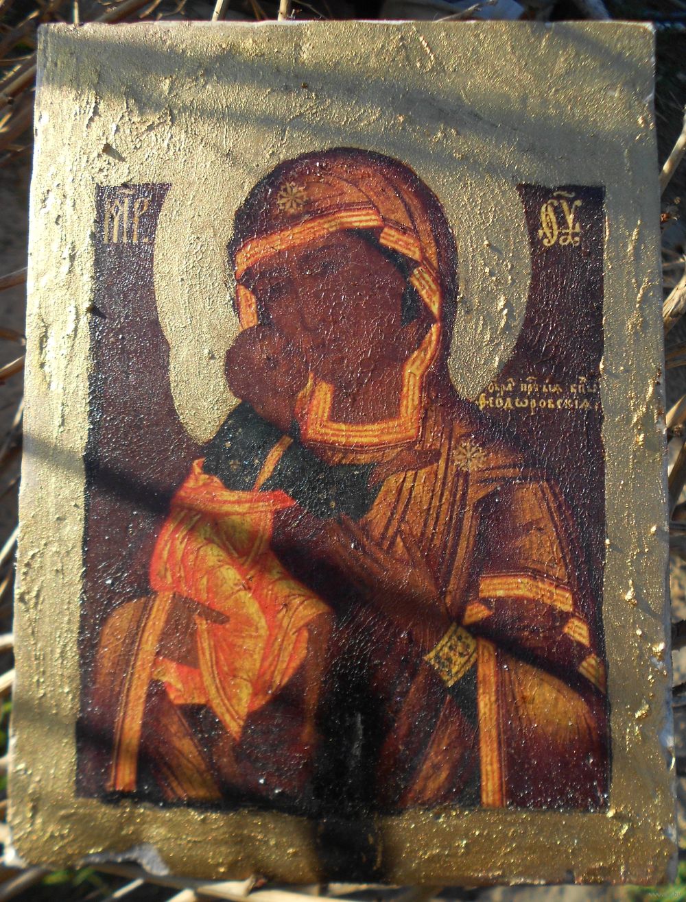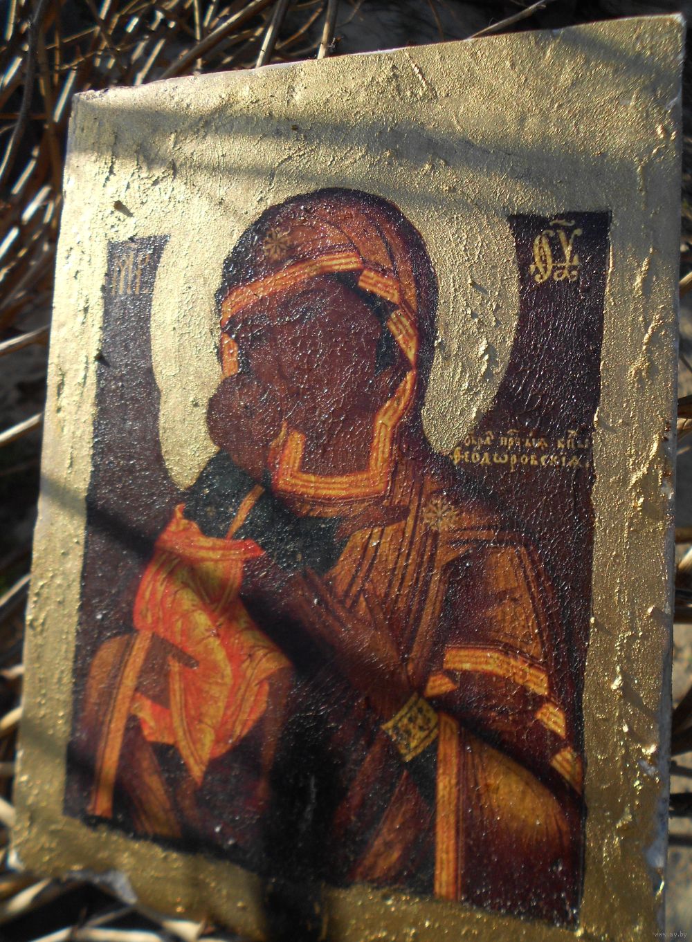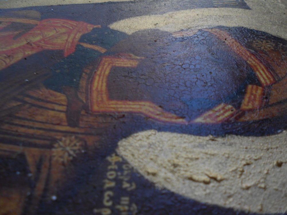 Икона на дереве, дерево покрыто материей, по материи мел, по мелу икона, краска потрескалась, возраст точный не знаю, размер 21,5 см на 16,5 см толщина 2,5 см.