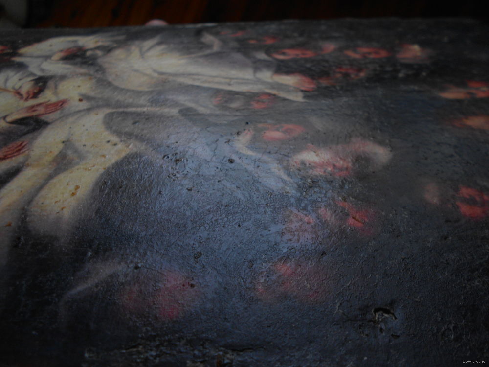 Икона на дереве, по дереву мел, по мелу икона , краска потрескалась , возраст не знаю, у меня лет 12 , размер 28,5 см на 16,5 см толщина 2,5 см.