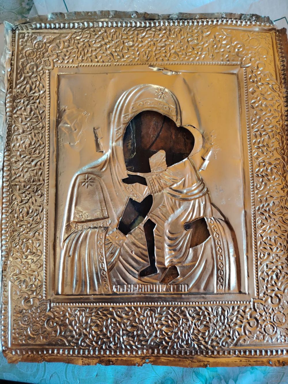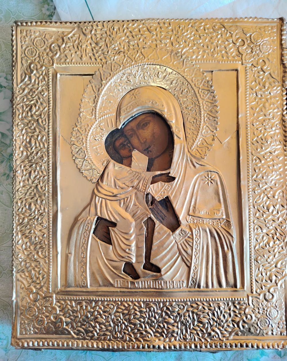 Икона 19 века, красивый оклад с огненным золочением. Размер 31-26см