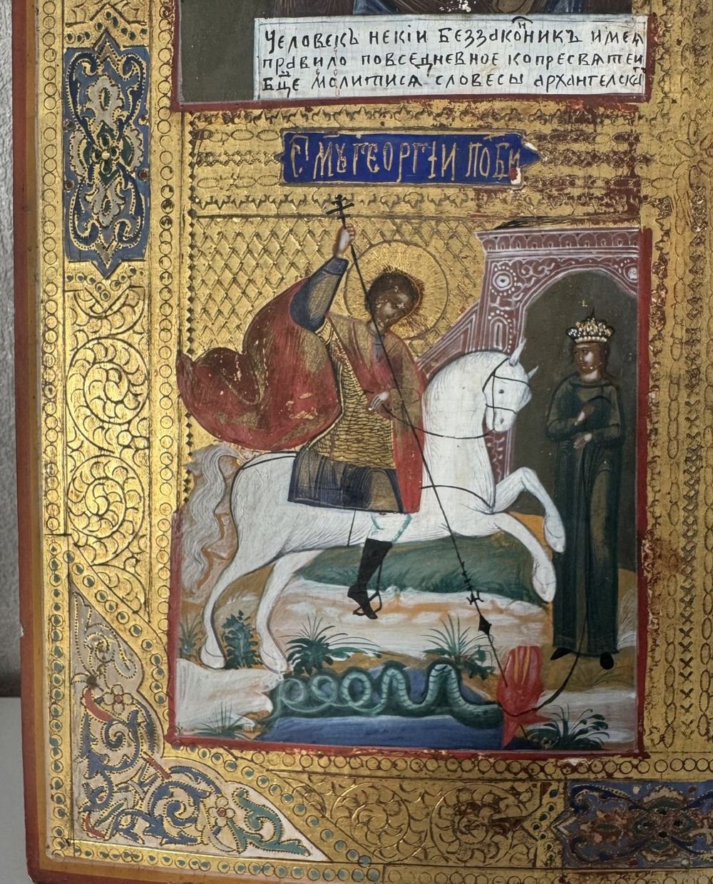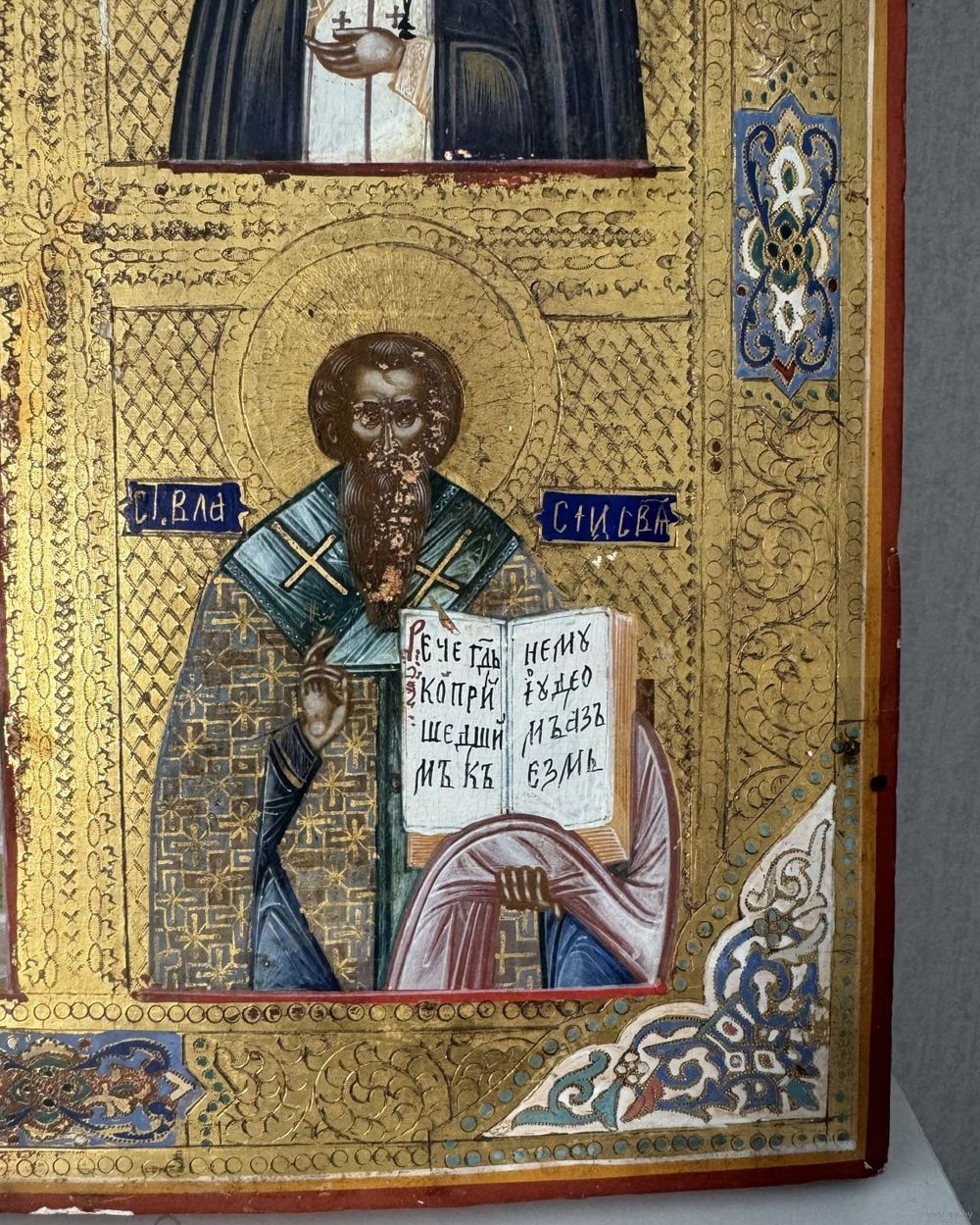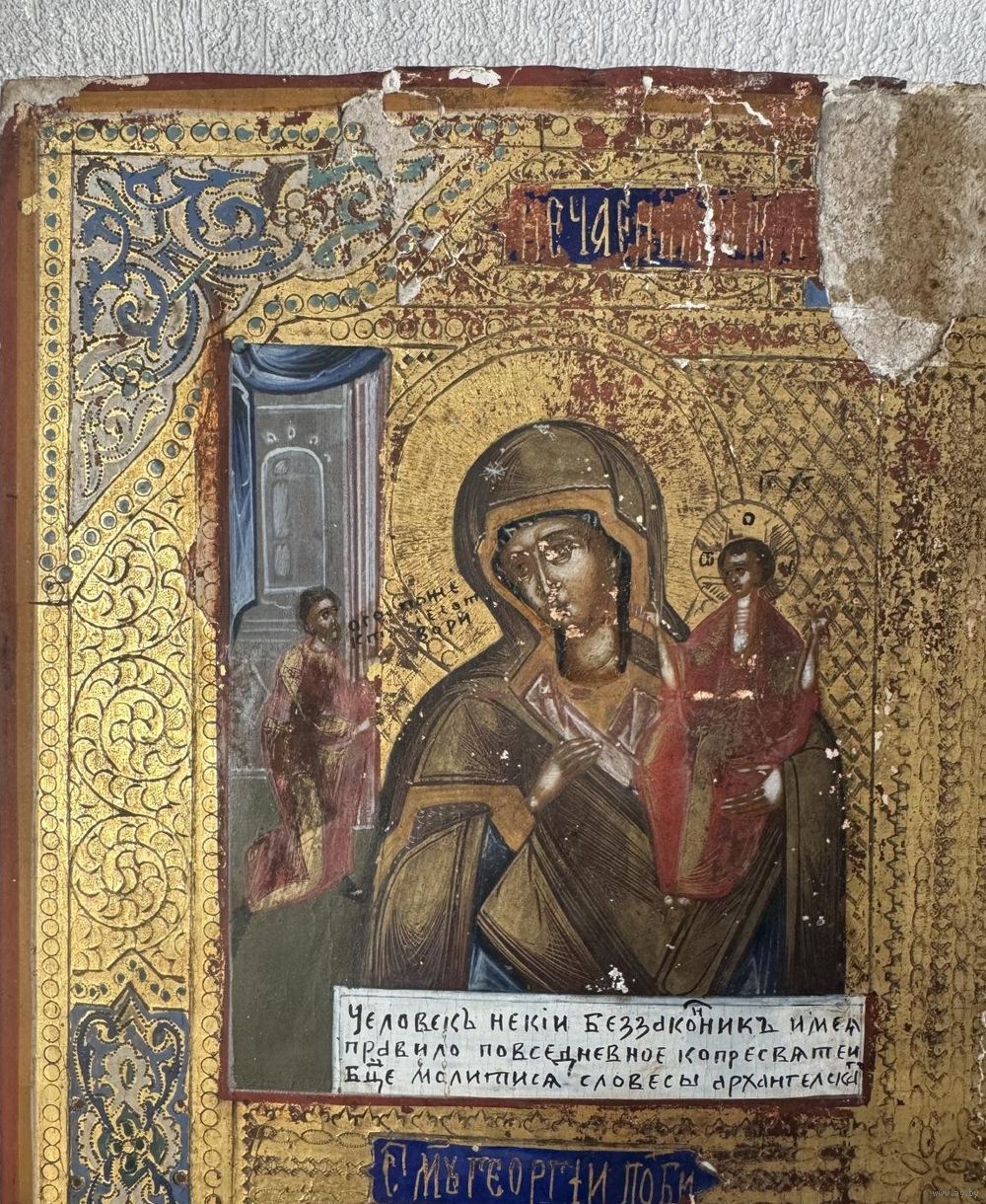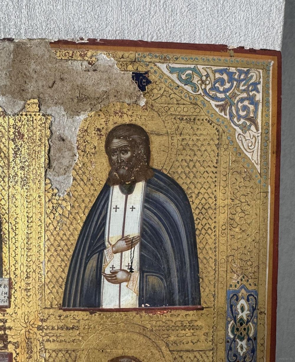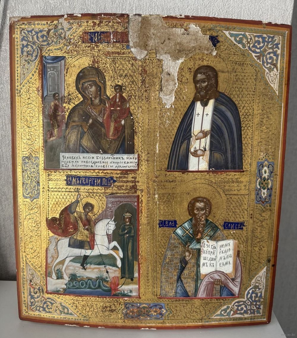 Икона Частник,Божией Матери Нечаянная Радость, Святой Серафим Саровский, Мученик Георгий Победоносец, Святой Власий. Живопись по Золоту. Доска Крепкая, кипарис. Без реставрации. Размер-36-31см.