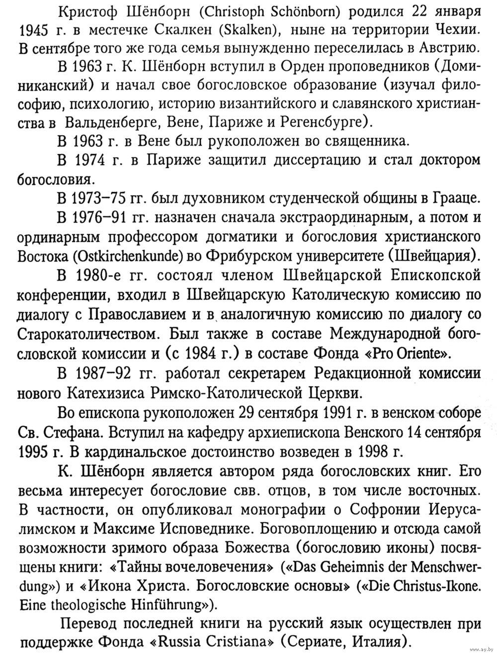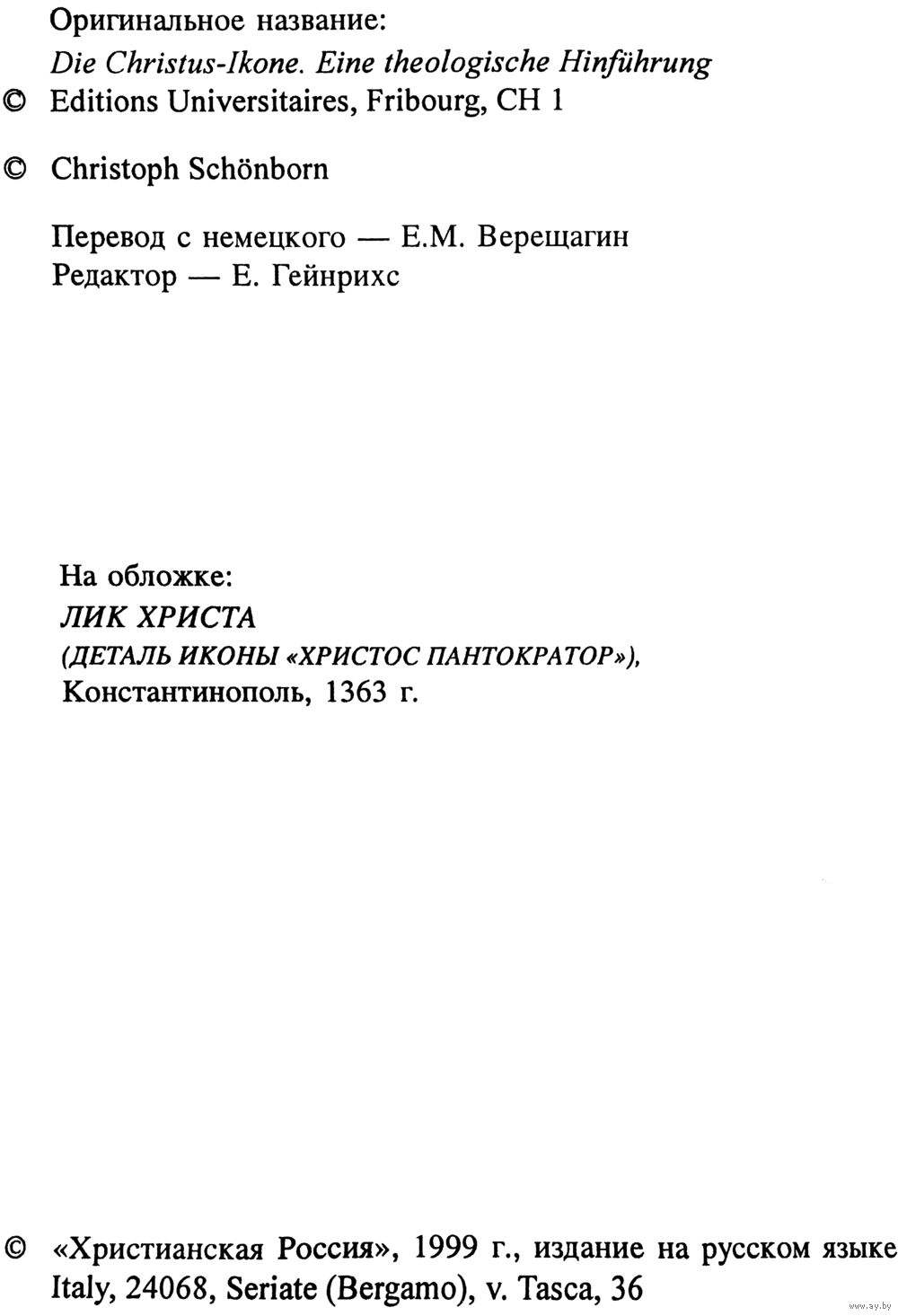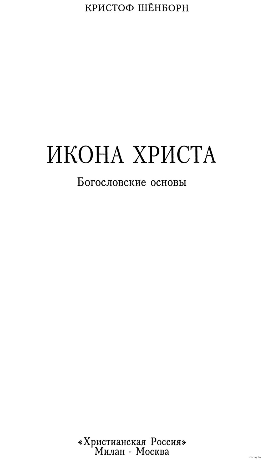 Шёнборн "Икона Христа". Ключевая книга по теме на русском языке. Для широкого круга читателей. Первое и единственное издание. Год издания - 1999. Тираж 2.000 экз. Переизданий больше НЕ было. Очень большая библиографическая редкость.