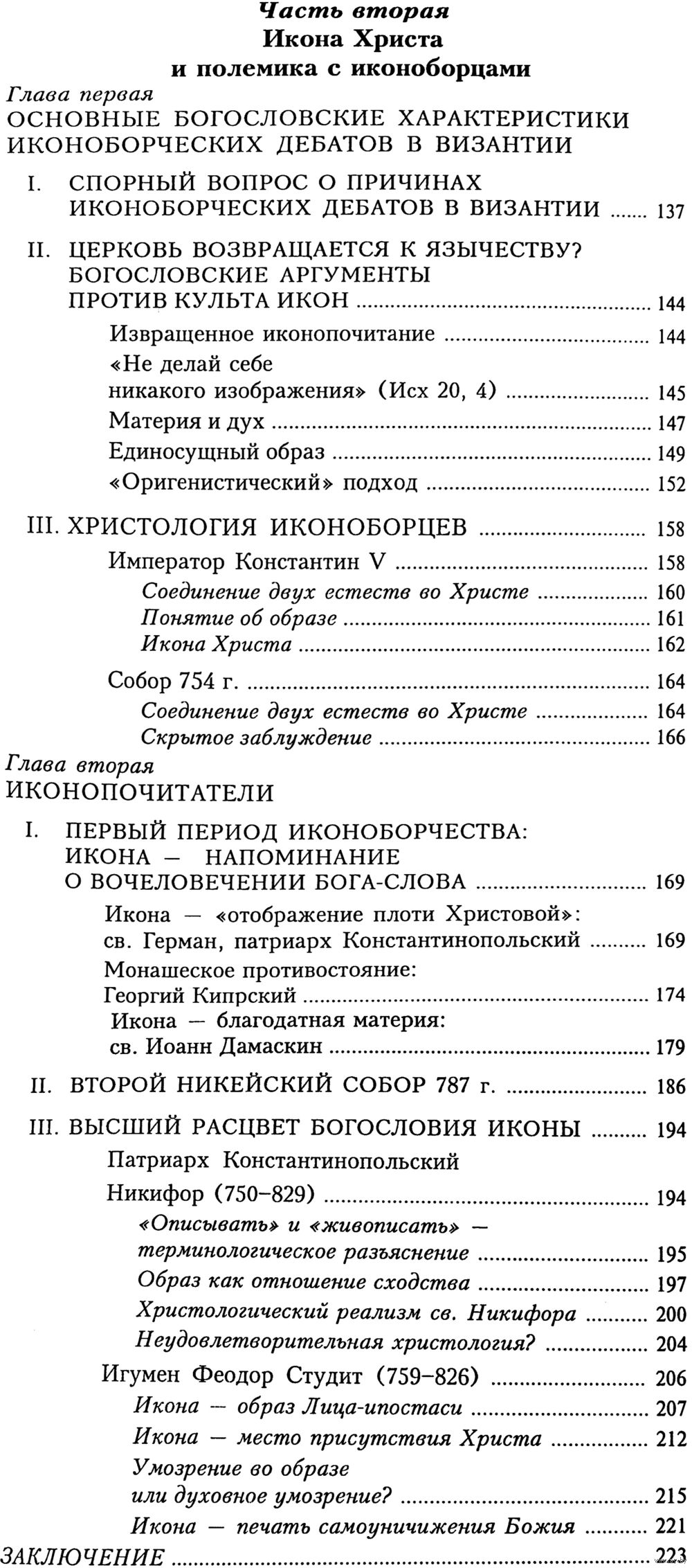 Автор рассматривает духовные и богословские основания, на которых возникло искусство иконописи: учение о вочеловечении Бога и т.д. Шенборн описывает долгий путь, проделанный темой образа Христа от Никейского собора 325 года до иконоборческих споров 7-8 веков и до наших дней.