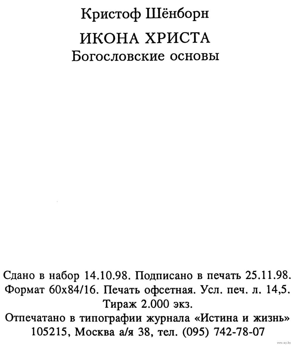 Шёнборн "Икона Христа". Для широкого круга читателей. Первое и единственное издание. Год издания - 1999. Тираж 2.000 экз. Переизданий больше НЕ было. Очень большая библиографическая редкость.