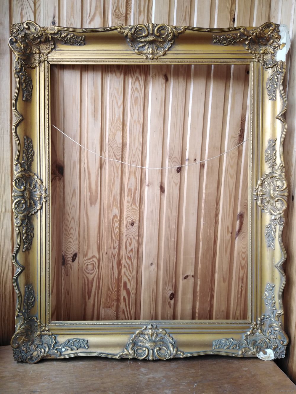 (Картинная рама вокруг иконы включена в лот (от рамы можно отказаться, тогда минус 500 рублей от цены). Проём данной рамы больше иконы (на 2 см по периметру), но симметрично - можно добавить уменьшающие проём планки (промежуточный подрамник, как в бельгийских картинах, см. лот 5037195413) или ничего не добавлять, а просто симметрично подвесить икону внутри проёма рамы). Размер окошка спереди: 57,5 х 74,5 см. Габариты 78 х 94.5 см. Цвет матовый, без блеска. (К раме прилагаются кусочек реставрационного воска и реставрационный состав-краска близко в цвет для самостоятельной реставрации сколов рамы (рама целиком представлена на последнем фото).