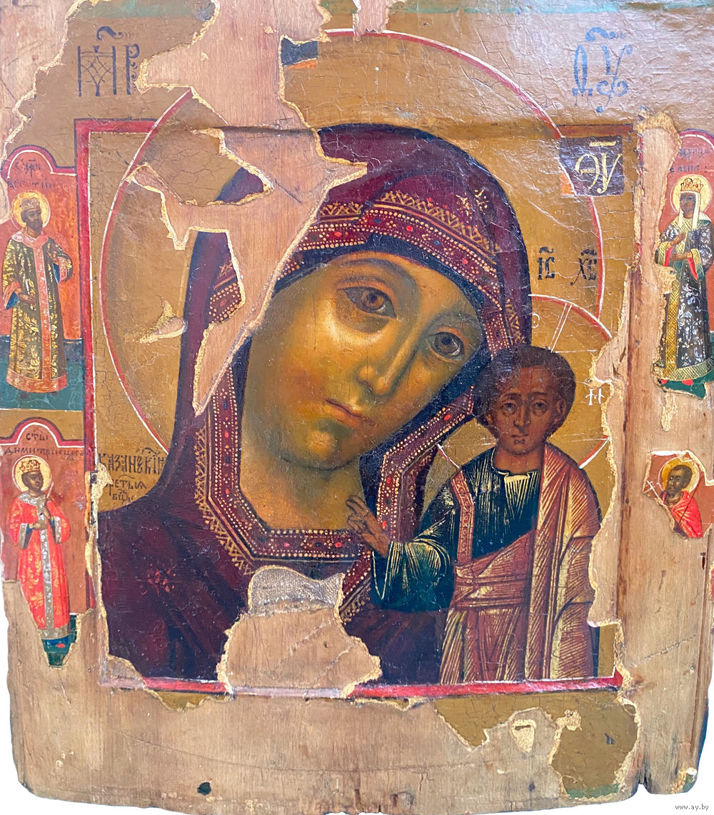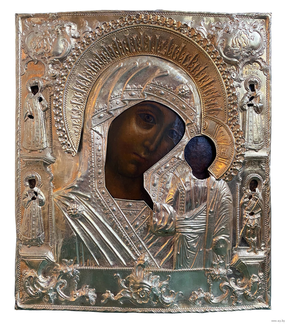 Здравствуйте! Икона Казанская Пресвятая Богородица. Конец 17-го начало 18-го века. Полеосные Святые: Константин, Елена , Дмитрий, Иоанн. Размер иконы: 27 х 31,5 см., толщина 3 см. Реставрация иконы в музейных мастерских: проклеена, помыта, укреплена, тонировки. Фото до и вовремя реставрации- по запросу.
