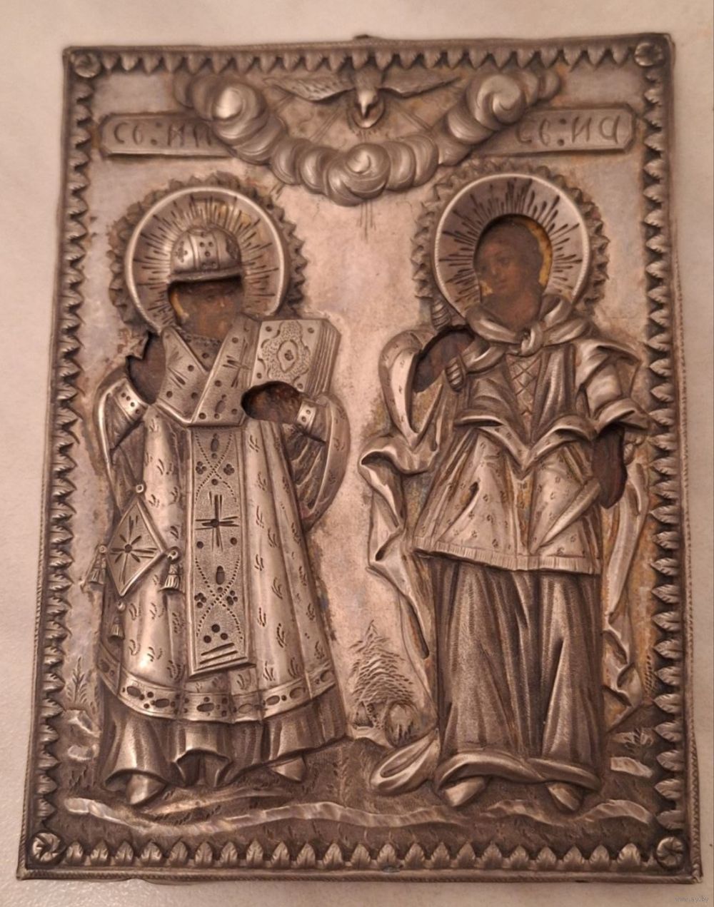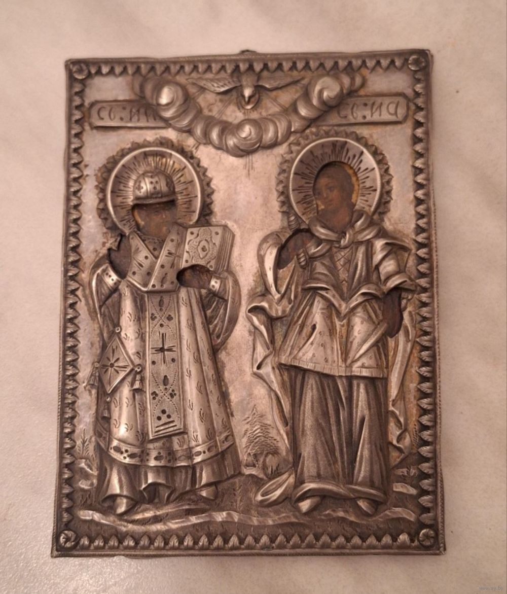 Святой преподобный Михаил Скопский и святой Иаиль. Оклад серебряный 84-ой пробы. Клейма есть. 18 век. Размеры 9х12см. Наложенного нет.