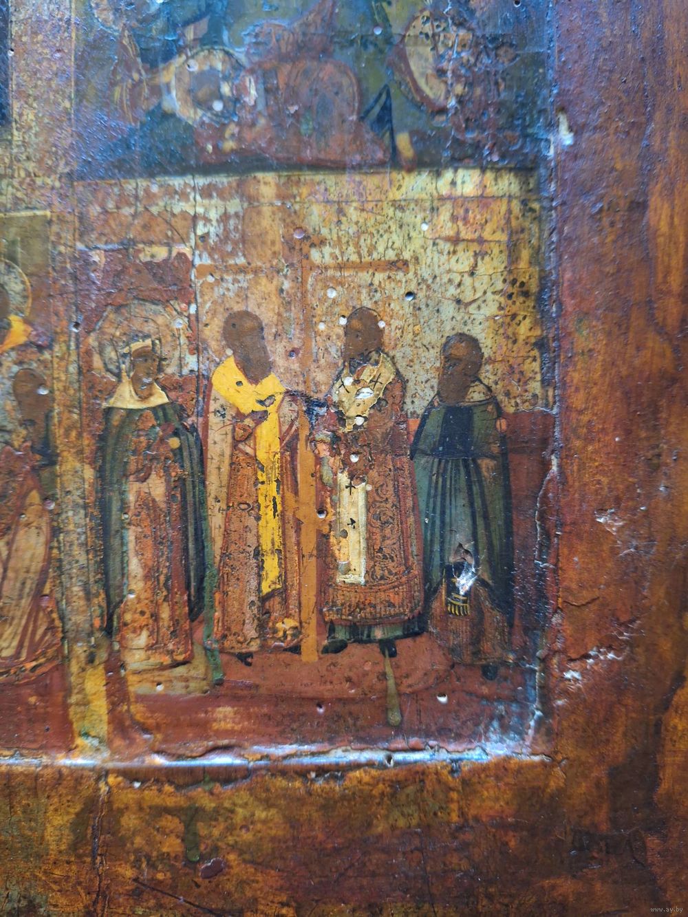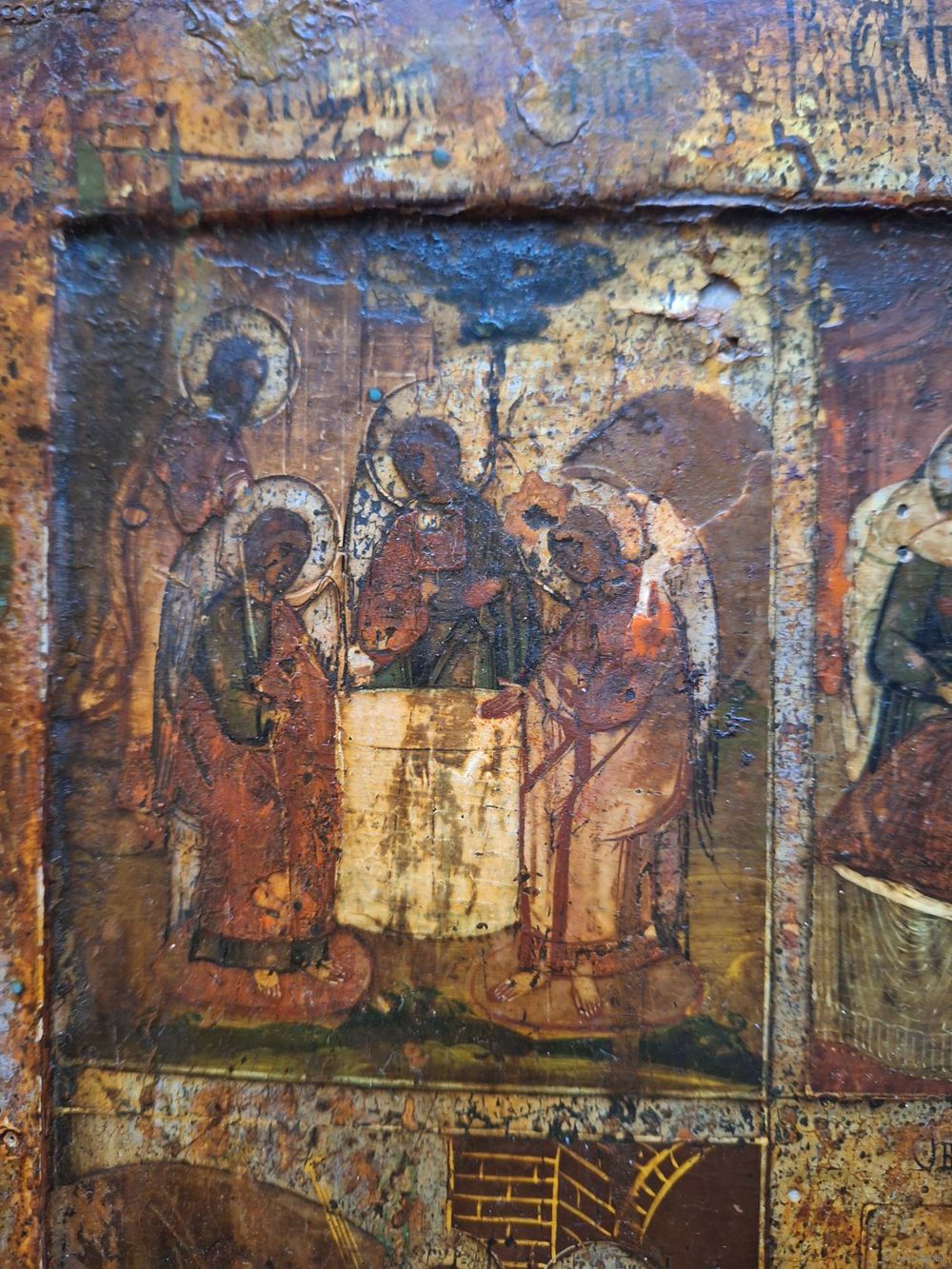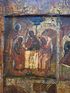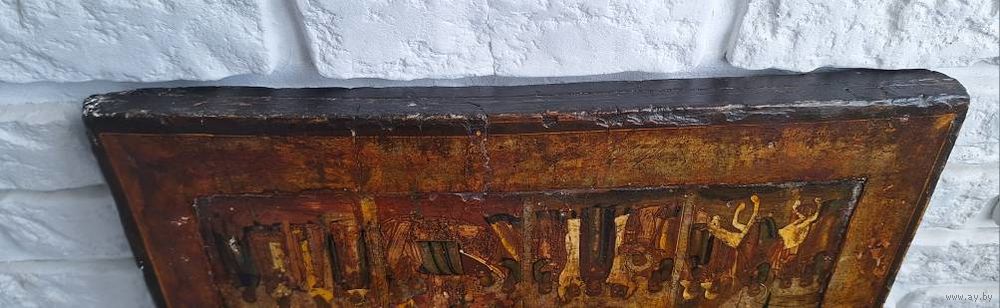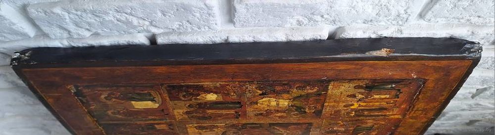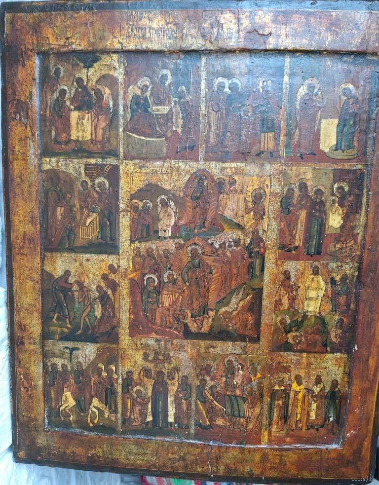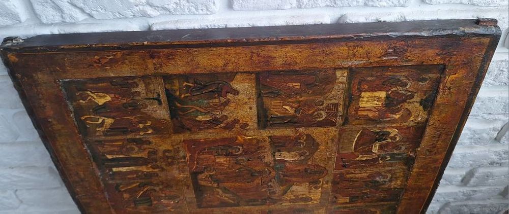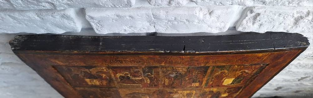 Икона Праздники, 18 век, темпера, ковчег. Размер: 53х44х2,7 см. Торцевые шпонки. Покрыта лаком делали правое поле, надписей на правом поле нет. В саму живопись вроде не вмешивались. Следы жука, на правой доске видно с торца и на обороте - шпаклевали. Живопись приятная, хороший размер.