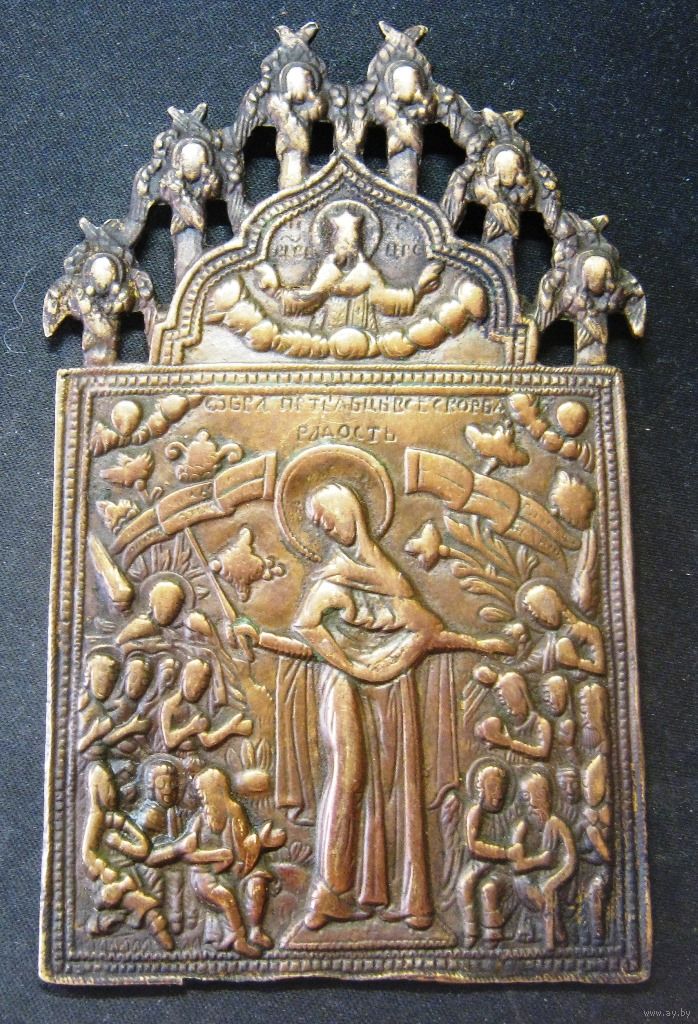 Икона с завершением в виде шести херувимов. Ниже расположено изображение Иисуса Христа в образе Великого Архиерея («Царь Царем») с распростертыми благословляющими руками. В центре иконы изображена Богородица с жезлом в правой руке, а левой рукой она осеняет болящих и скорбящих людей, которыми наполнено пространство образа иконы. Над народом воспарили ангелы, которые по молитвам праведников дают страждущим благодеяния от имени Богородицы.