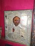 Крепкая доска. Потерян венец оклада оклад посеребрян. По бокам трое святых.